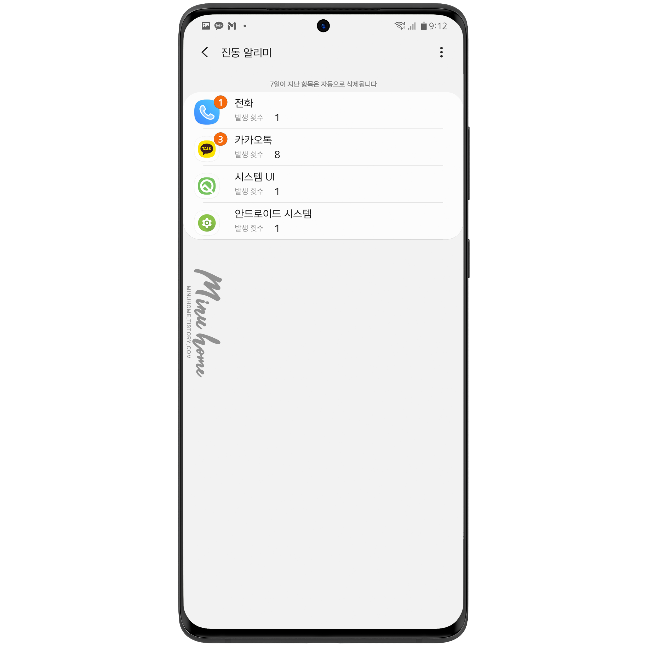 먼저 첫번째 진동 알리미 입니다, 진동 알리미 에서는 스마트폰에서 진동이 발생할 경우 기록이 남는 기능입니다.