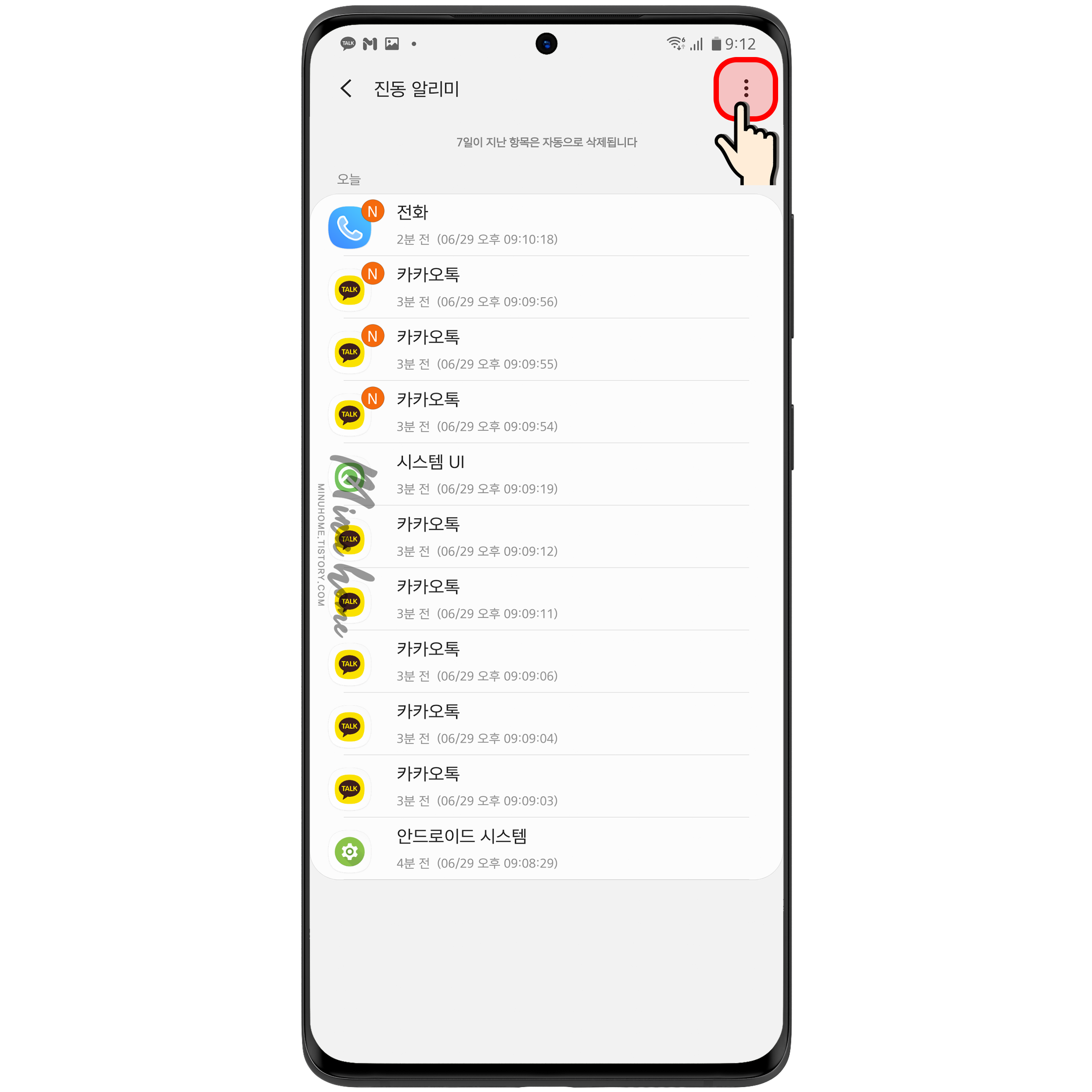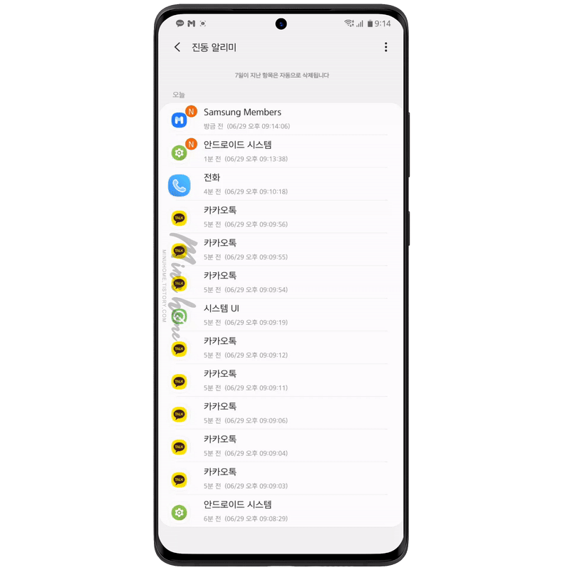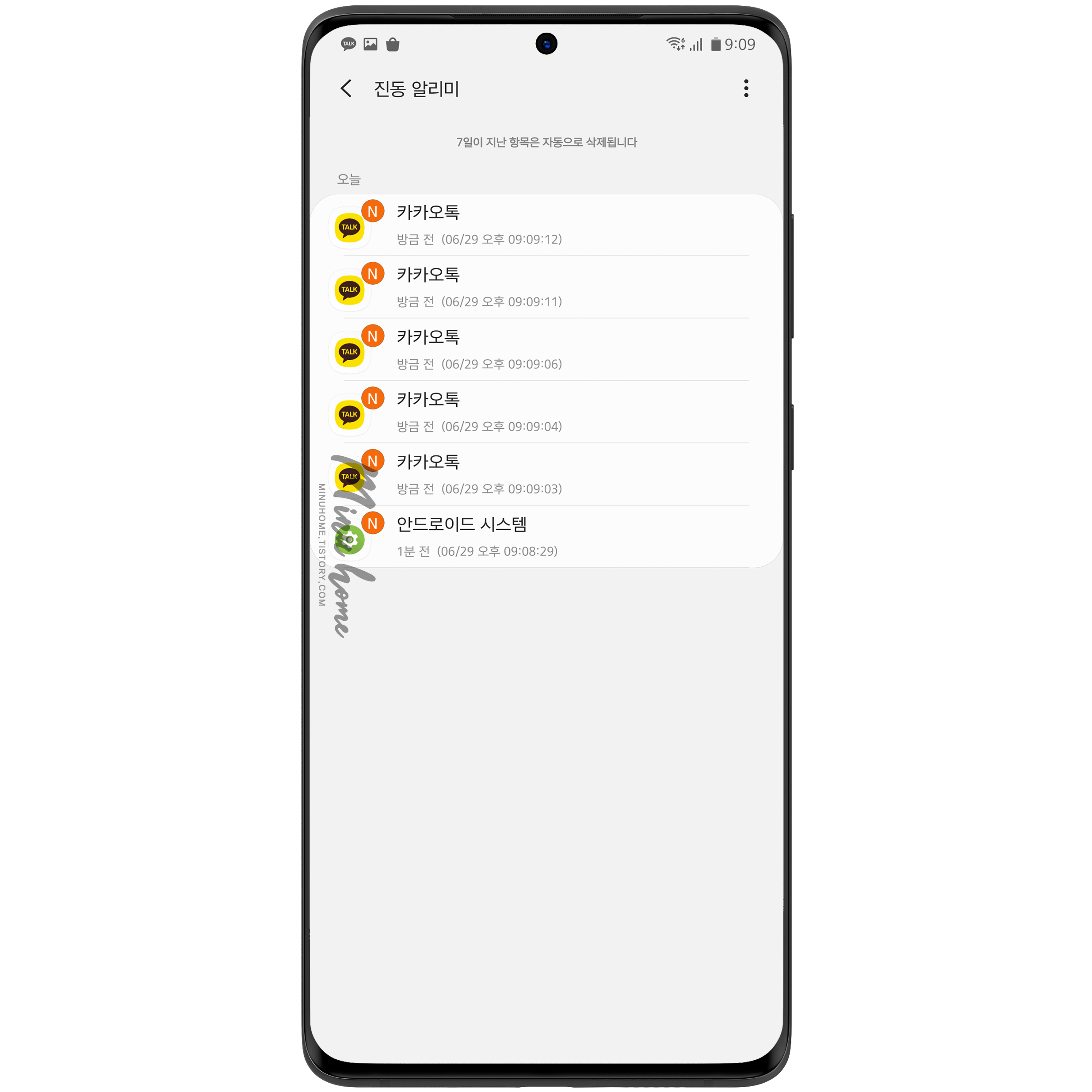 내가 진동으로 알림을 받기위해 설정해둔 앱의 경우 알림과 함께 진동이 발생하면 진동이 발생한 시점을 기준으로 위쪽에 하나씩 쌓이는 방식입니다.