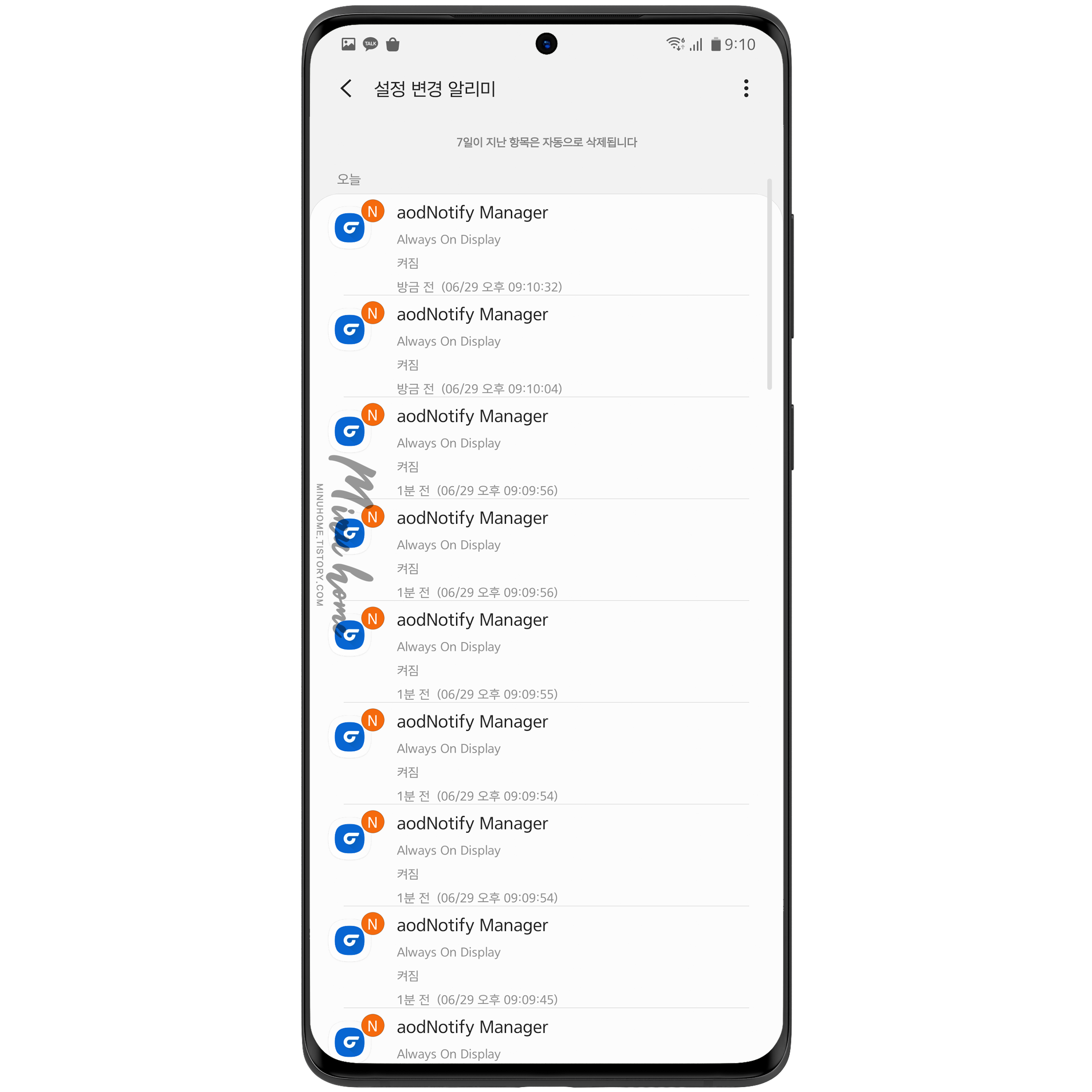 필자는 aodnotify 앱을 이용해 앱의 알림을 받도록 설정하였습니다, 켜짐이라는 문구와 함께 1분마다 aod 상태에서 알림이 표시되도록 해두었기 때문에 해당 설정 변경이 기록되고 있습니다.