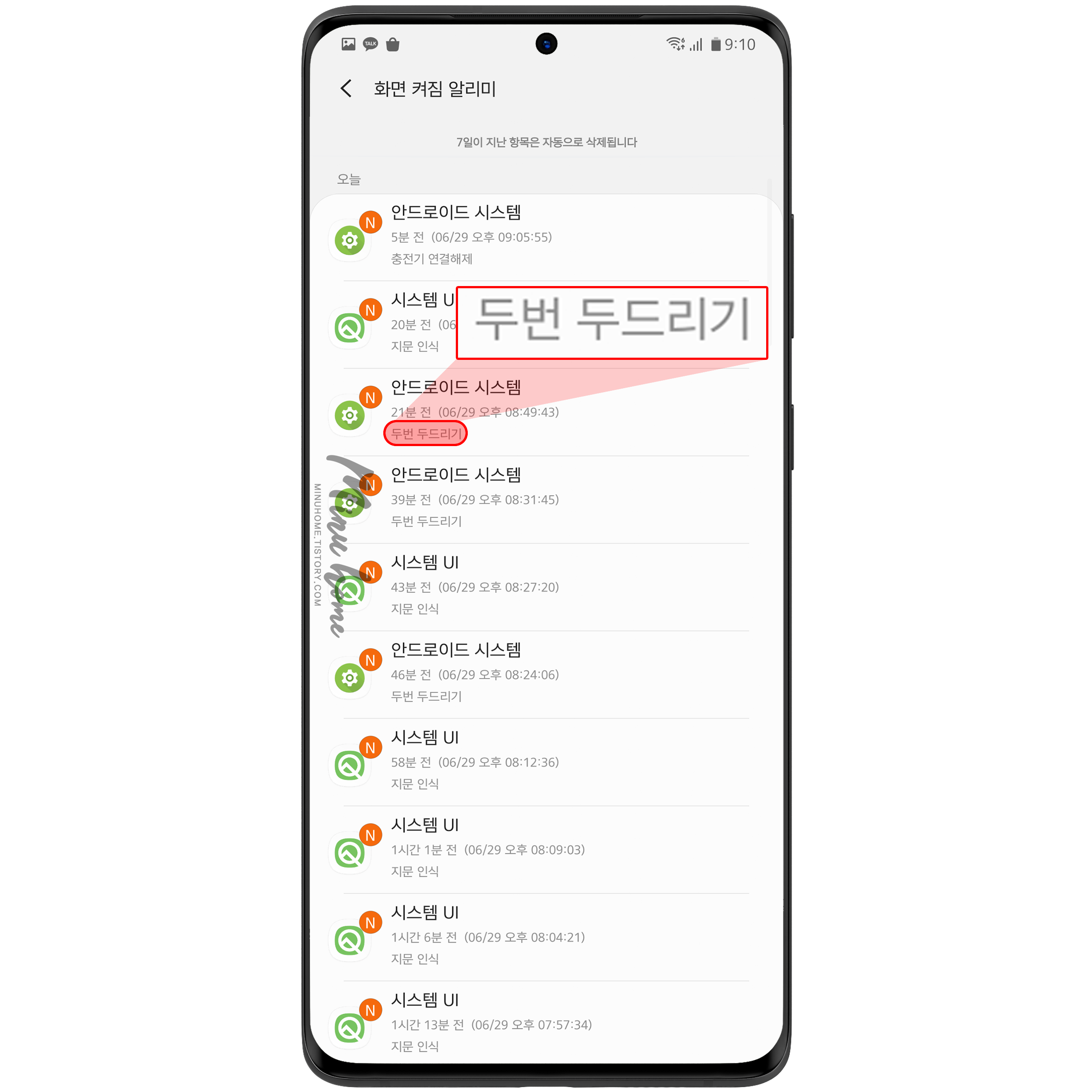 두번 두드리기를 통해 화면을 켰을 때 두번 두드리기 라는 명칭과 함께 화면이 어떻게 켜졌는지에 대한 내용이 있어 오작동의 원인을 찾을 때 유리한 기능입니다.