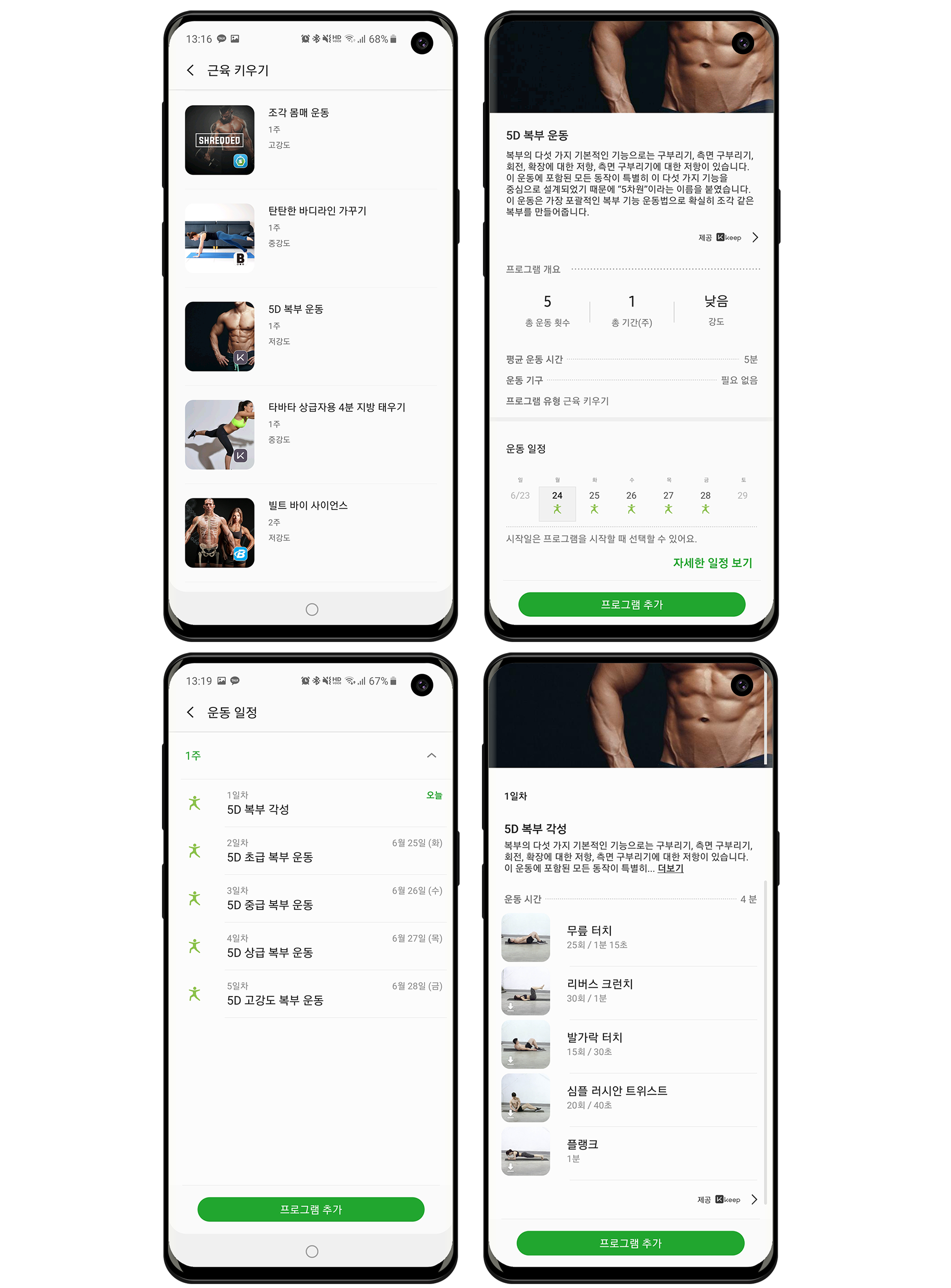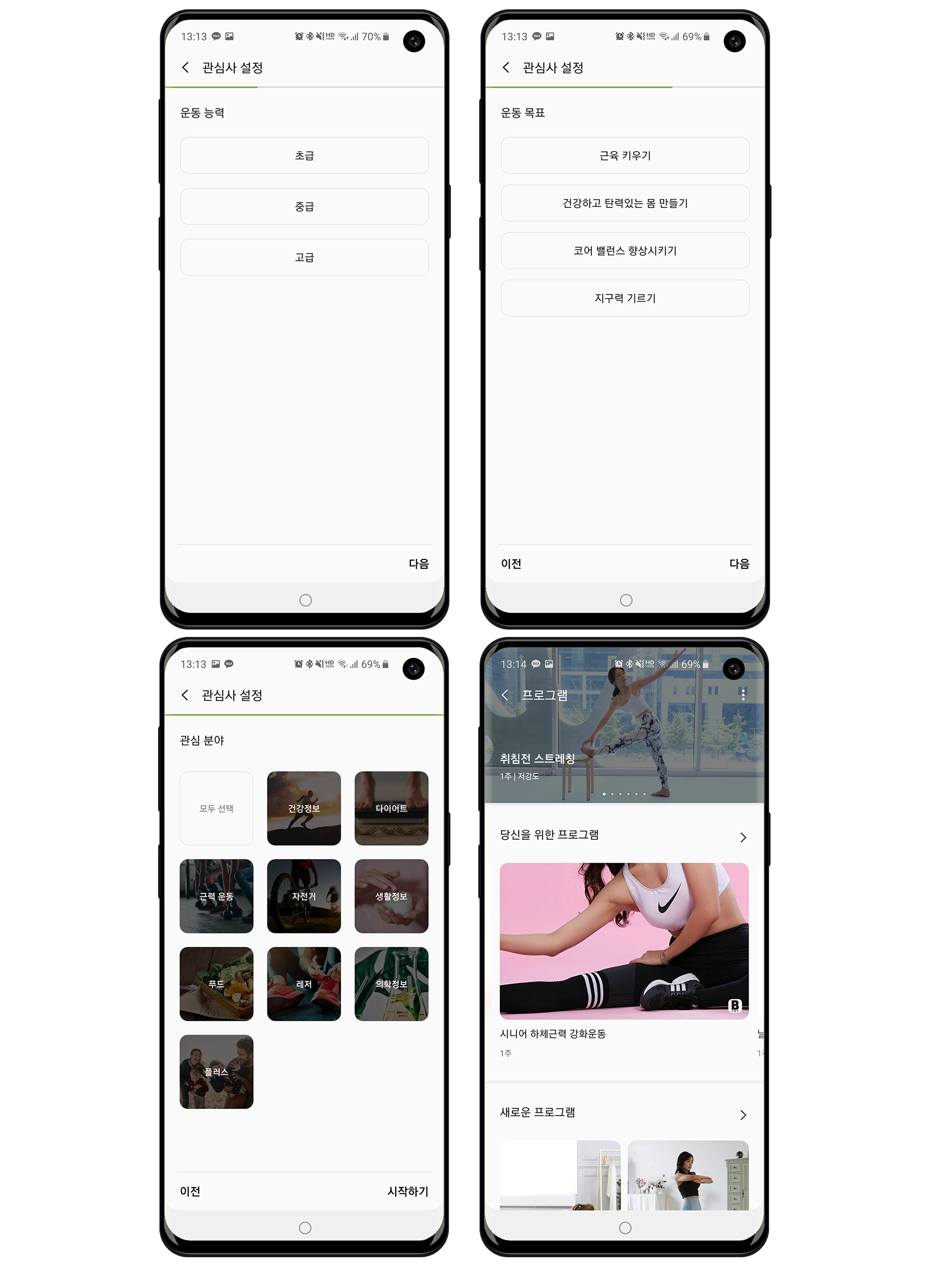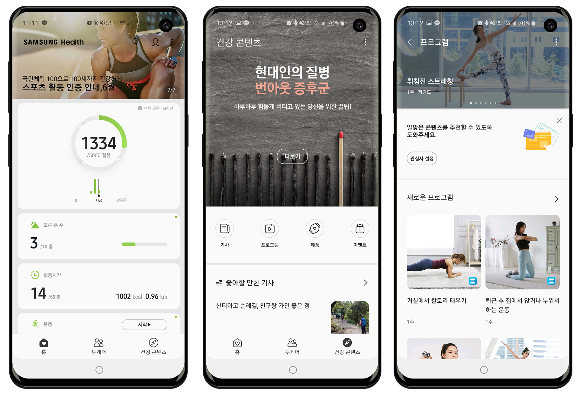 삼성 헬스 앱에서 하단 탭 바 건강 콘텐츠 클릭 -> 프로그램 클릭하여서 ‘피트니스 프로그램’을 켜실 수 있습니다.