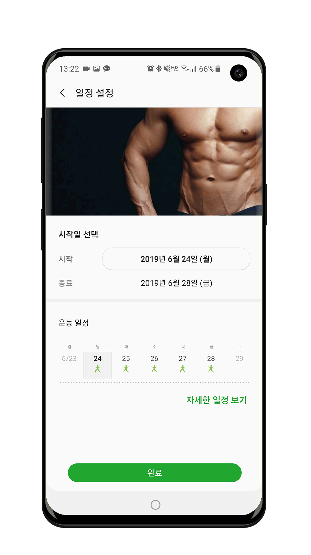 그리고 하단에 ‘자세한 일정 표시’ 버튼을 누르시면 각 일별로 운동 일정이 나와있으며, 일차를 선택하시면 일차별로 어떤 운동을 하는지 상세하게 나와있습니다.