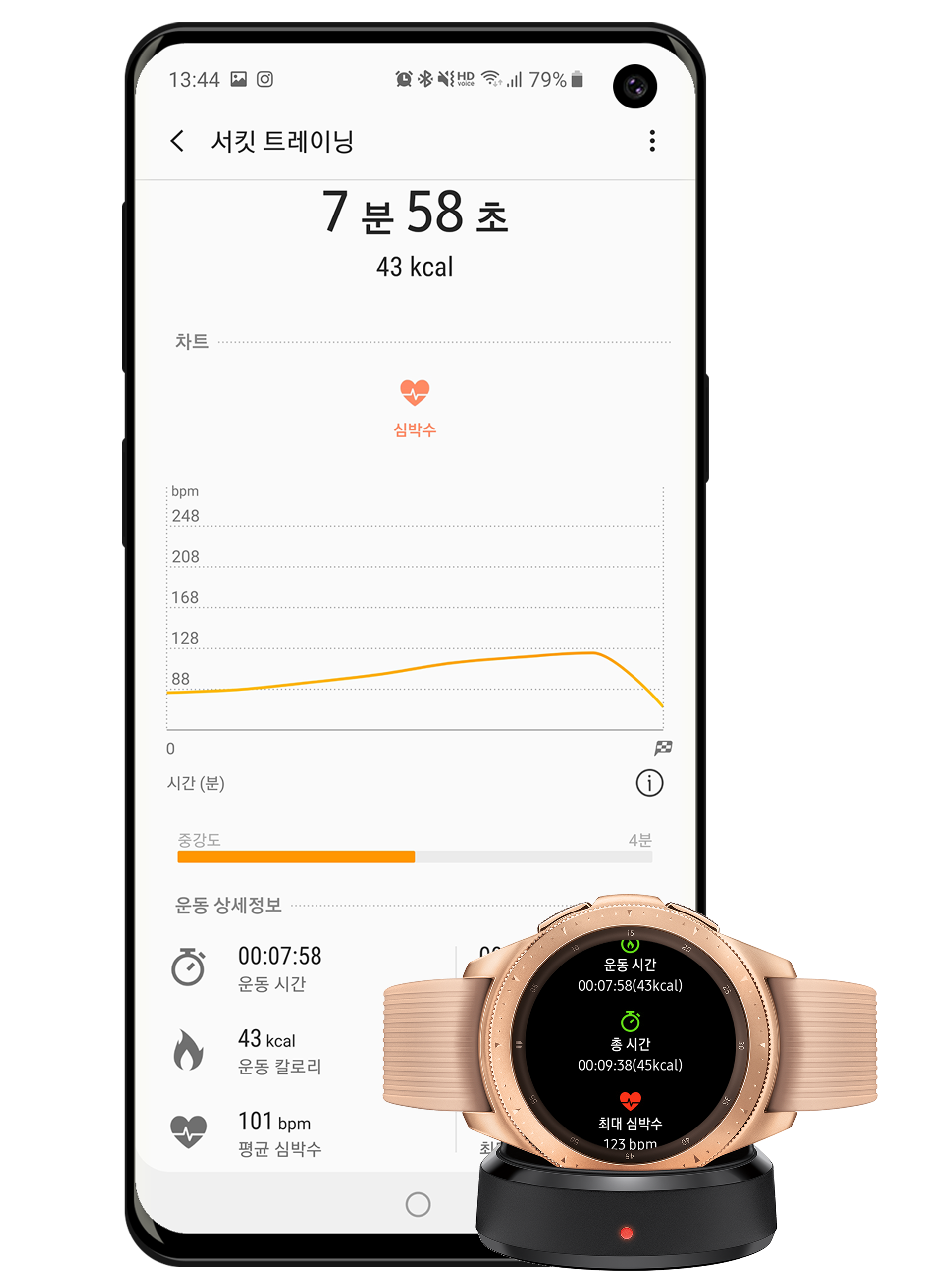 운동을 시작하면 기기 화면에 가이드 영상이 뜨고, 갤럭시 워치에서도 자동으로 운동 측정이 시작되어서 워치 화면에서도 현제 하고 있는 운동 정보를 볼 수 있습니다.
