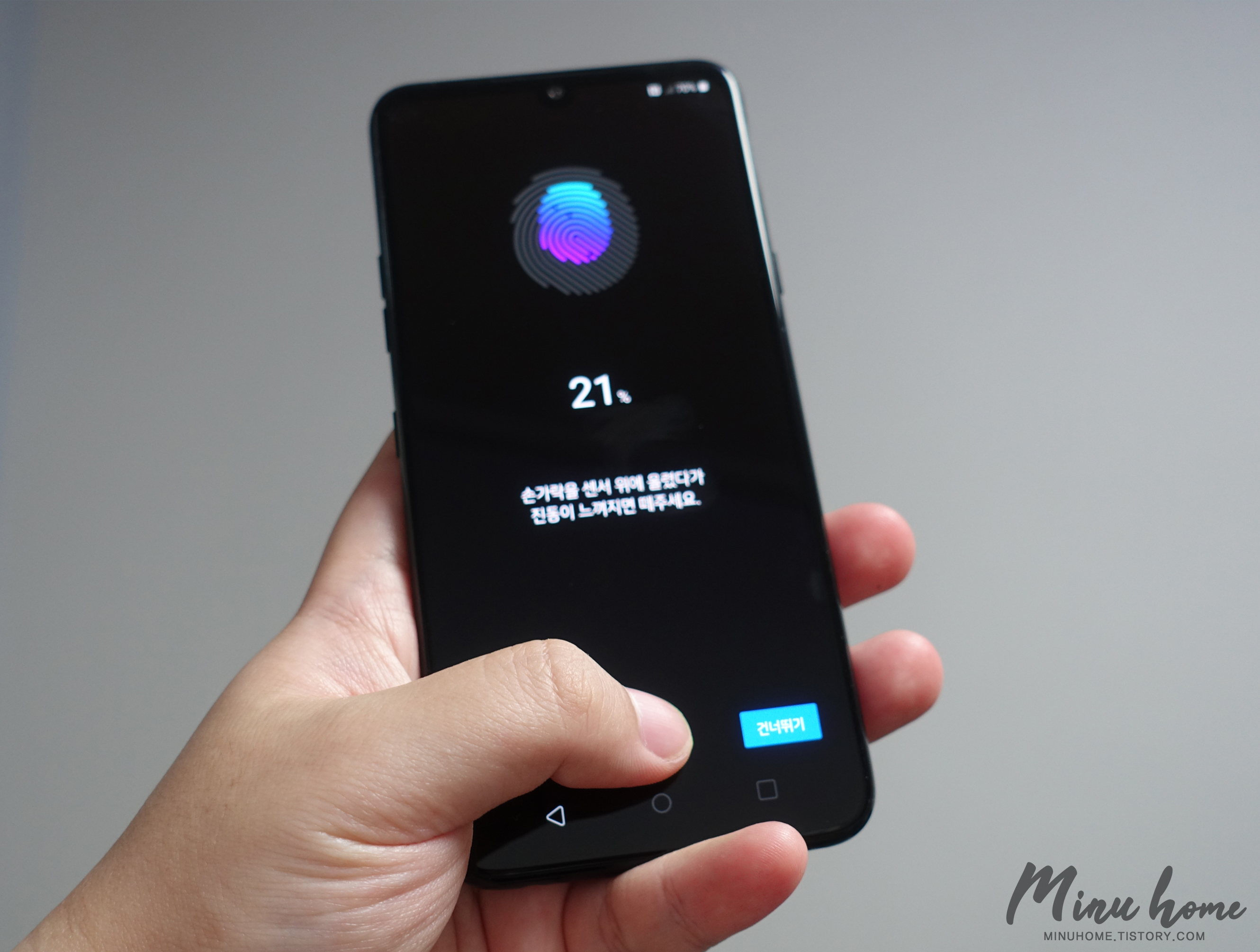 지문인식을 테스트해봤을 때 인식률은 나쁘지 않았으며 후면에 있던 지문센서가 스크린 안으로 쏙 들어가서 너무 편했습니다.