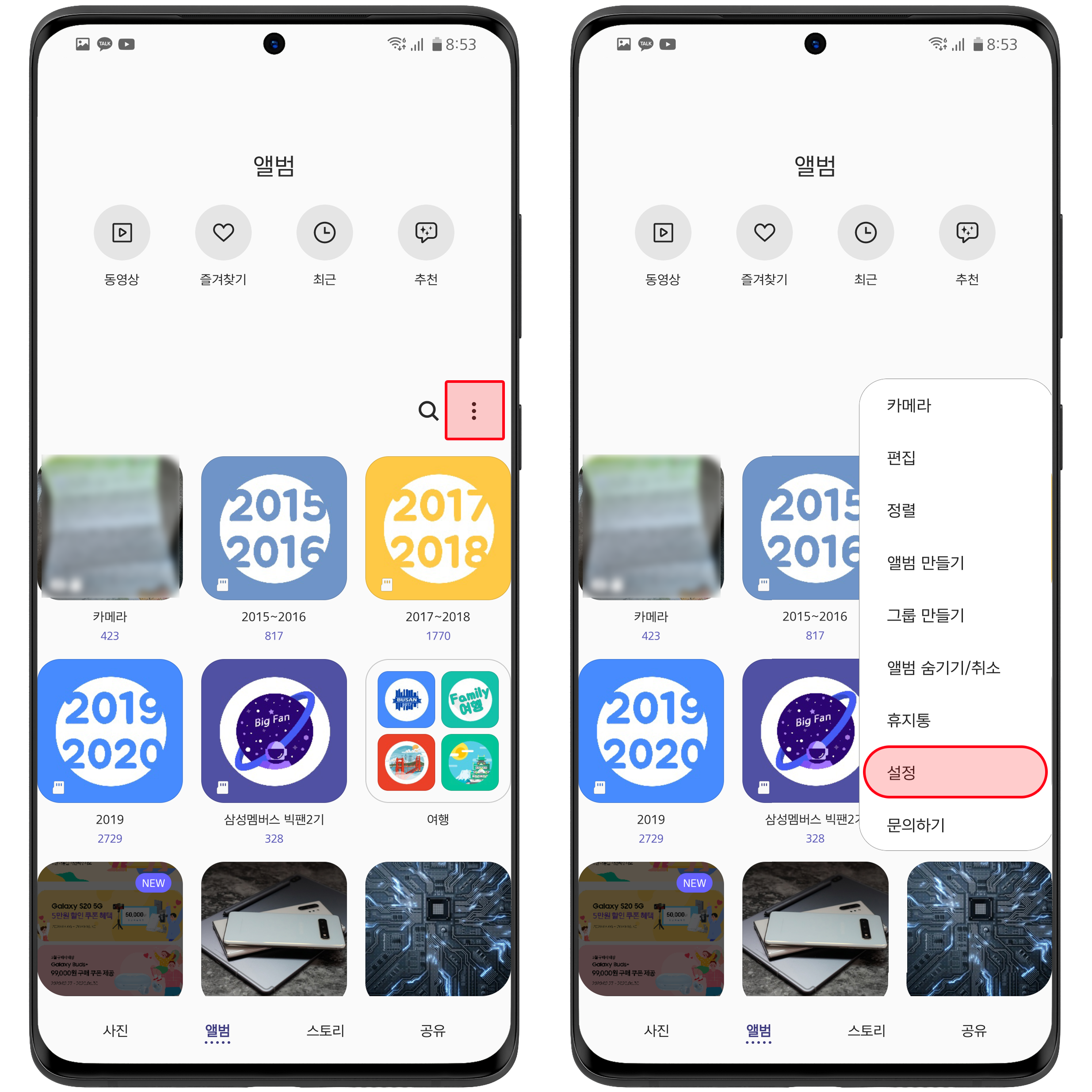 삼성 갤러리 앱을 실행 하신 후 우측 상단에 메뉴[︙]를 눌러 설정 메뉴로 이동합니다.