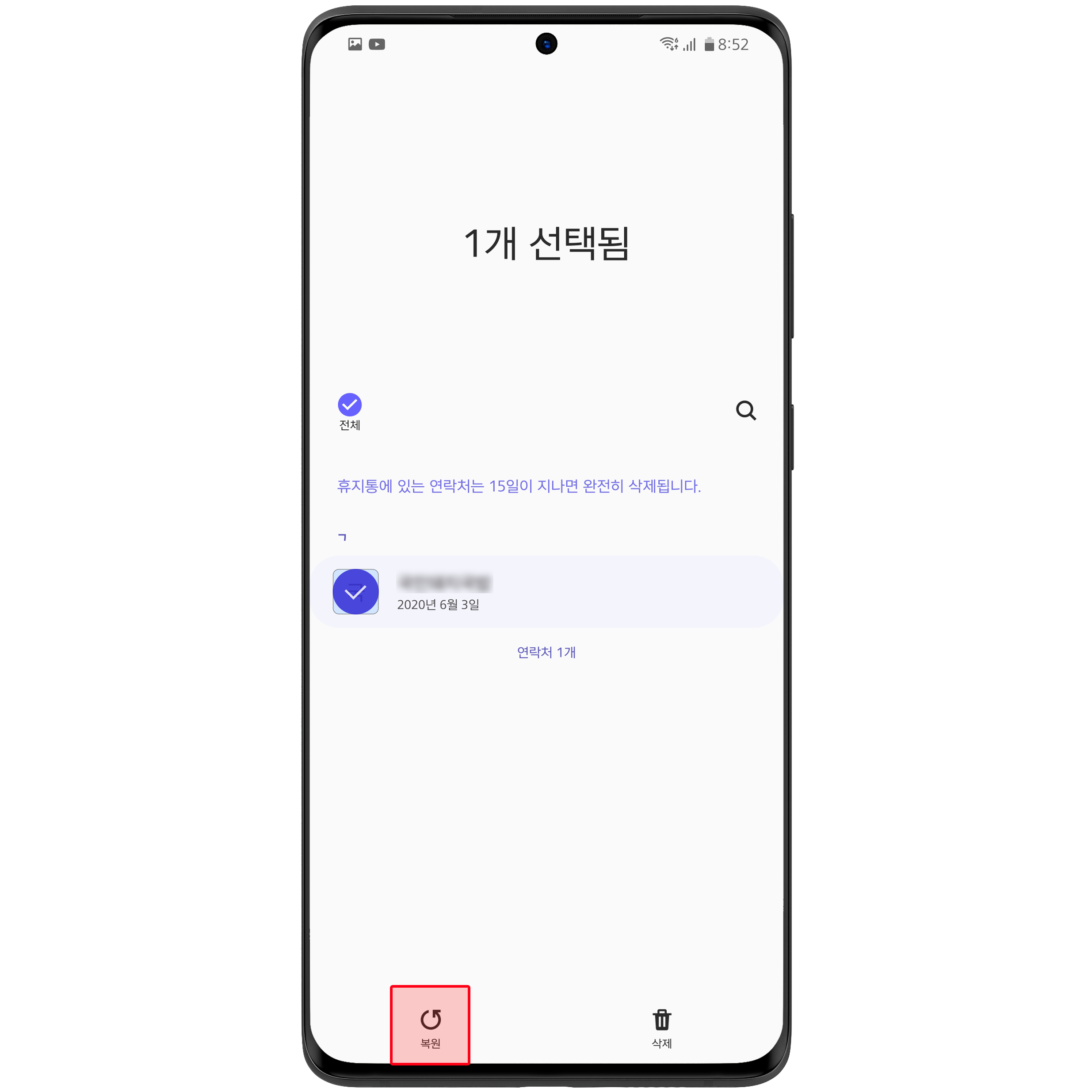 선택된 연락처는 하단에 복원 또는 삭제 메뉴가 나타나는데 여기서 원하는 선택을 하시면 됩니다.