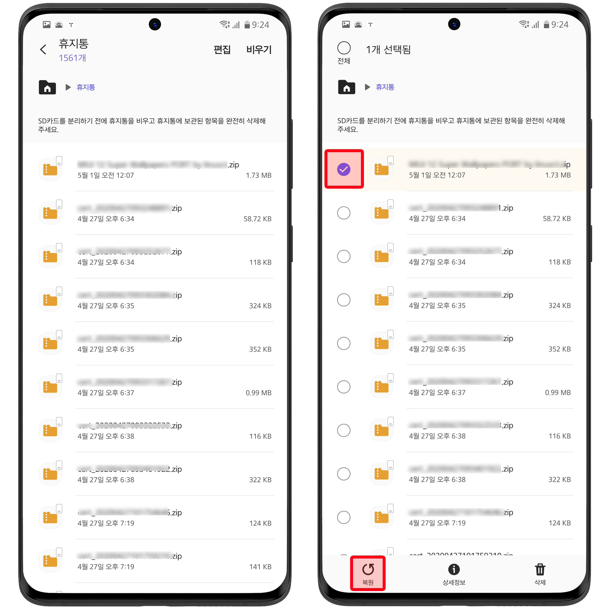 여기서 내가 복구하고자 하는 파일을 길게 눌러 선택할 수 있으며, 선택 후 하단에 복원 혹은 삭제 메뉴가 나타납니다.