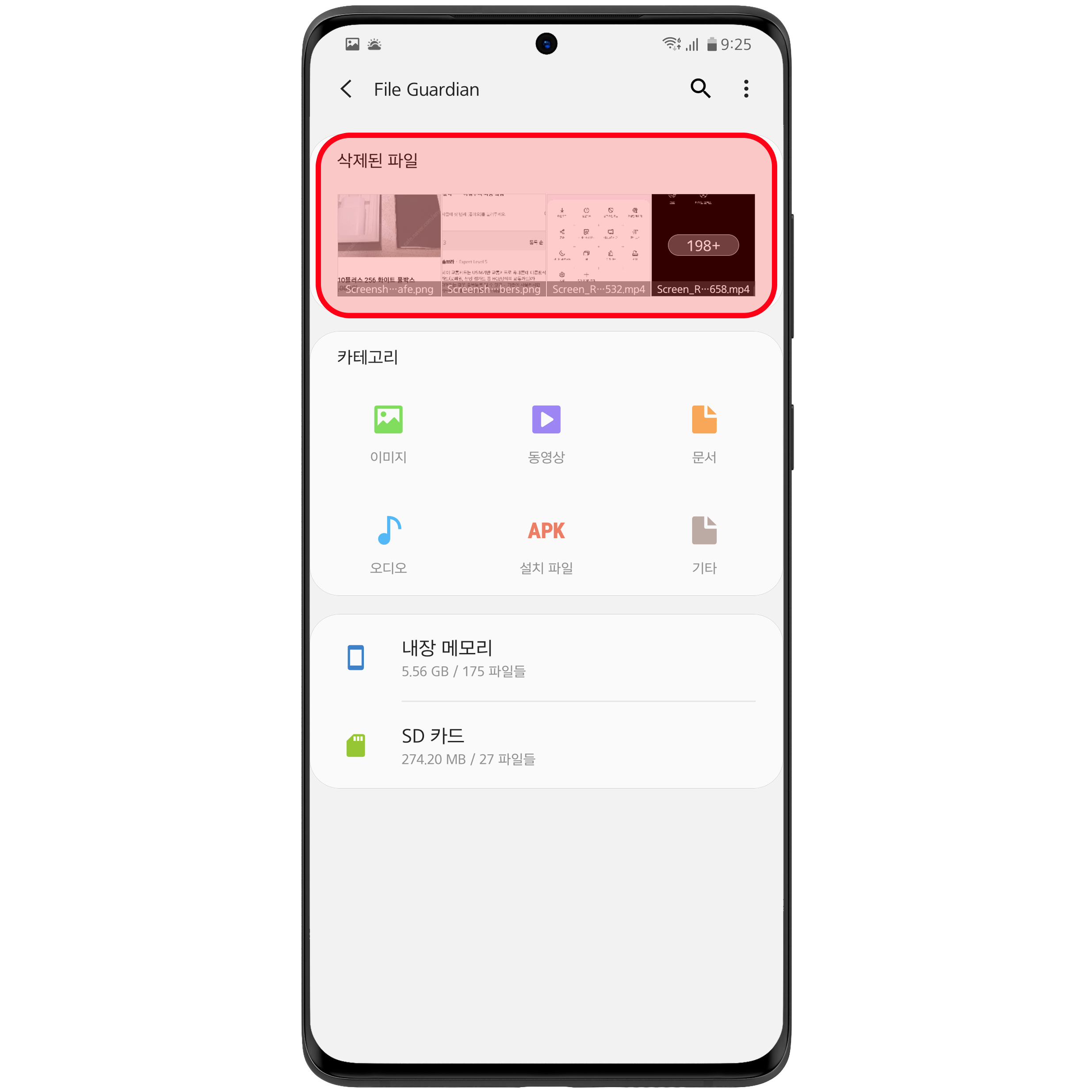 삭제된 파일을 확인할 수 있는 카테고리 리스트는 이미지, 동영상, 문서, 오디오, apk, 기타(txt,bin파일 등) 입니다.
