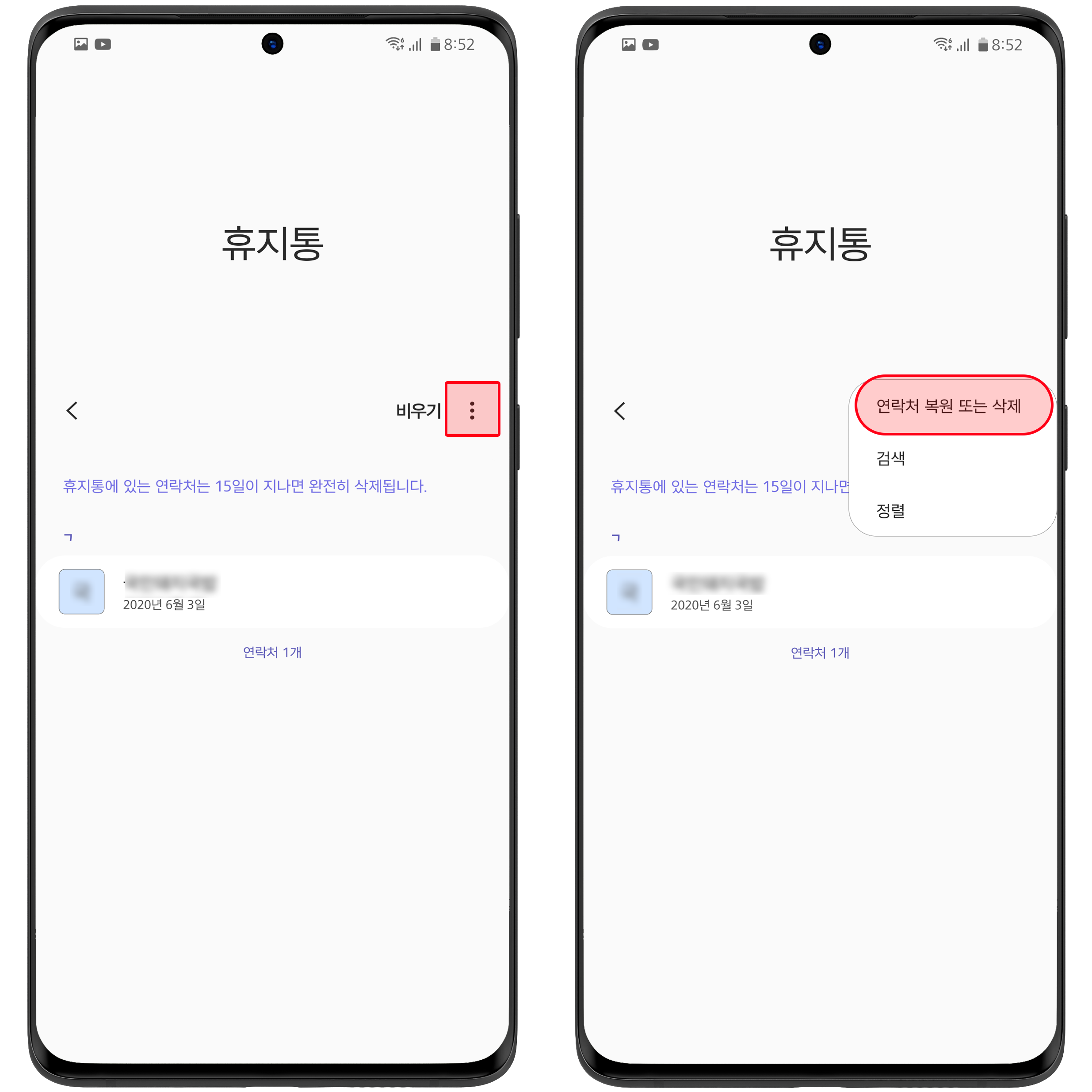 여기서 복구 혹은 영구삭제를 하기위해서는 우측상단에 메뉴[︙]를 선택하여 [연락처 복원 또는 삭제]를 통해 복원과 삭제를 할 수 있습니다.
