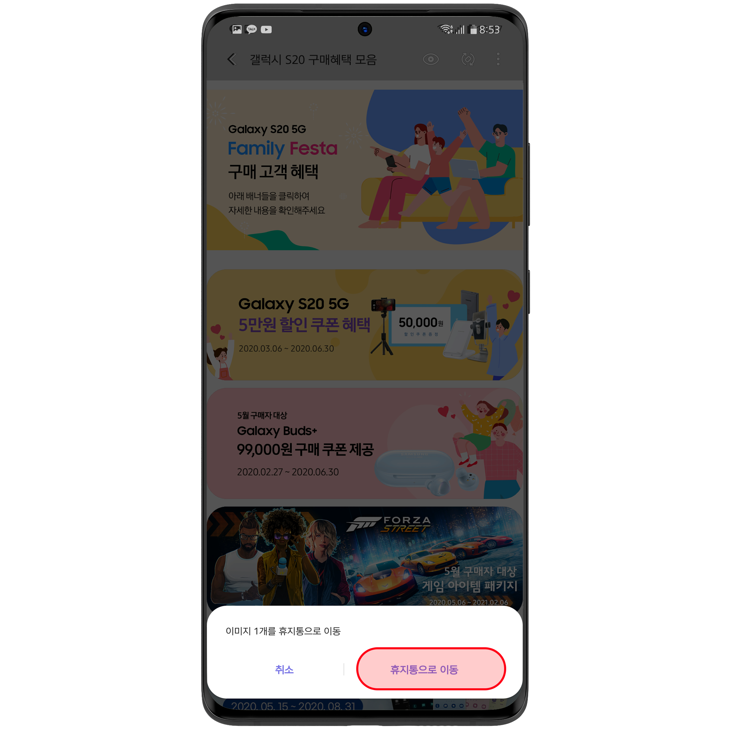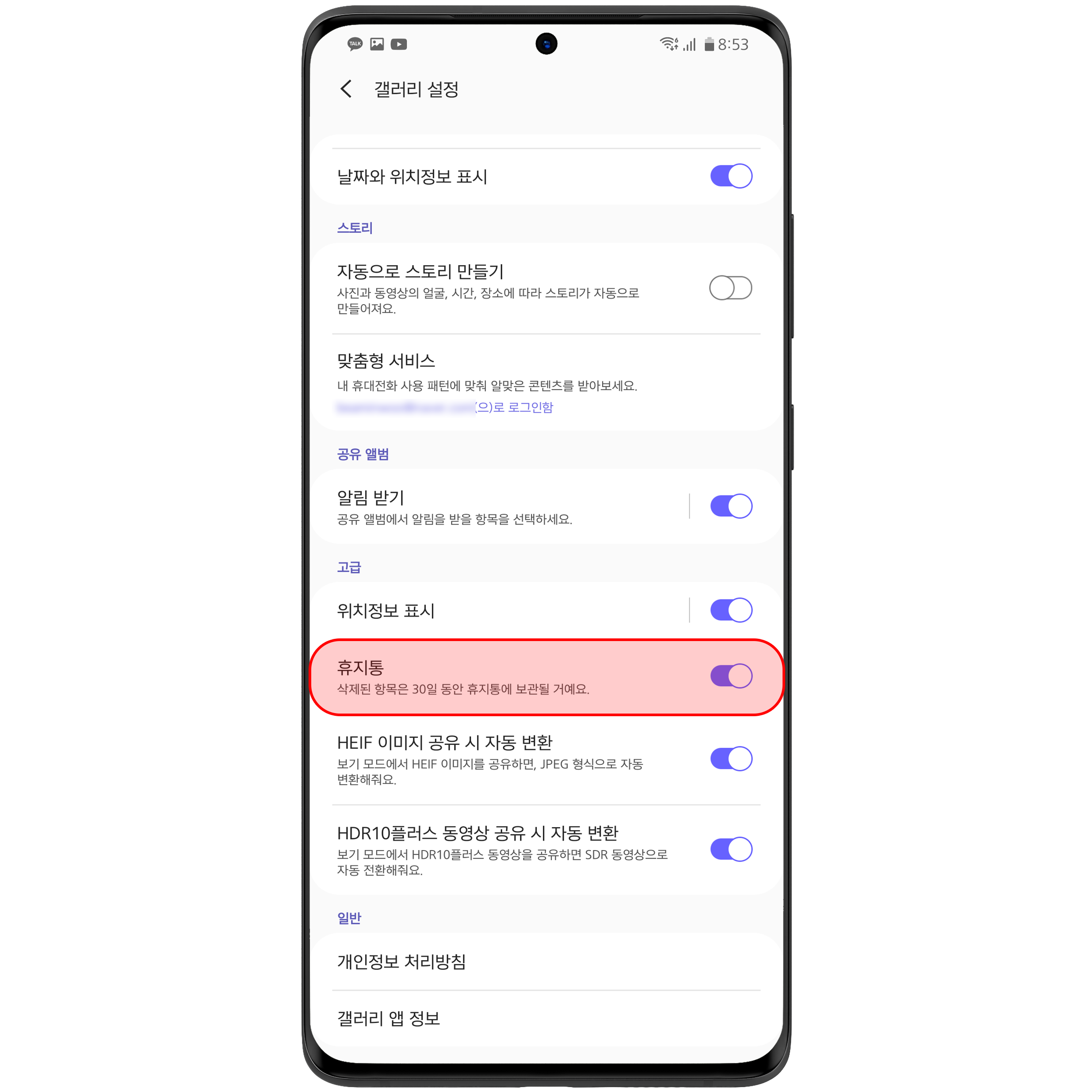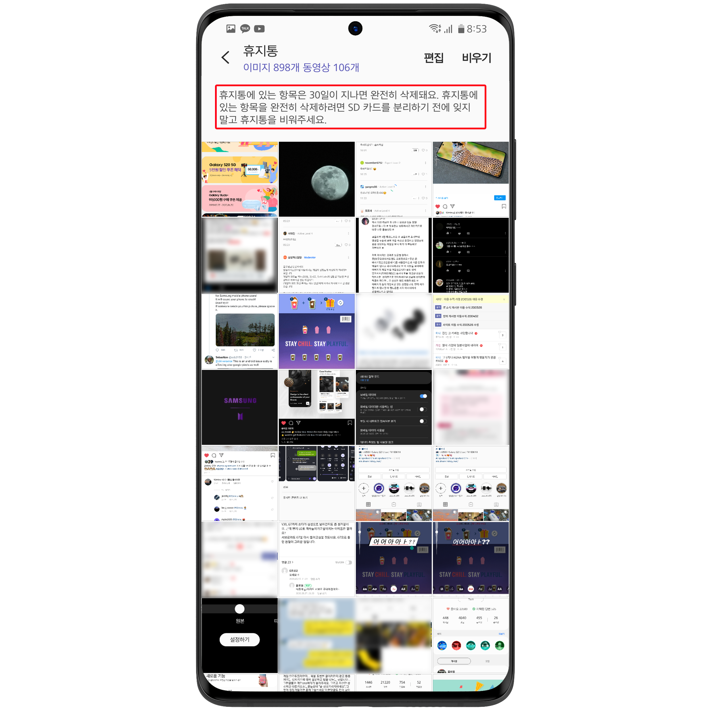 우리의 소중한 추억과 일상이 기록된 갤러리의 소중한 자료도 휴지통을 이용하여 실수로 삭제할 수 있는 경우의 수를 방지해보세요.