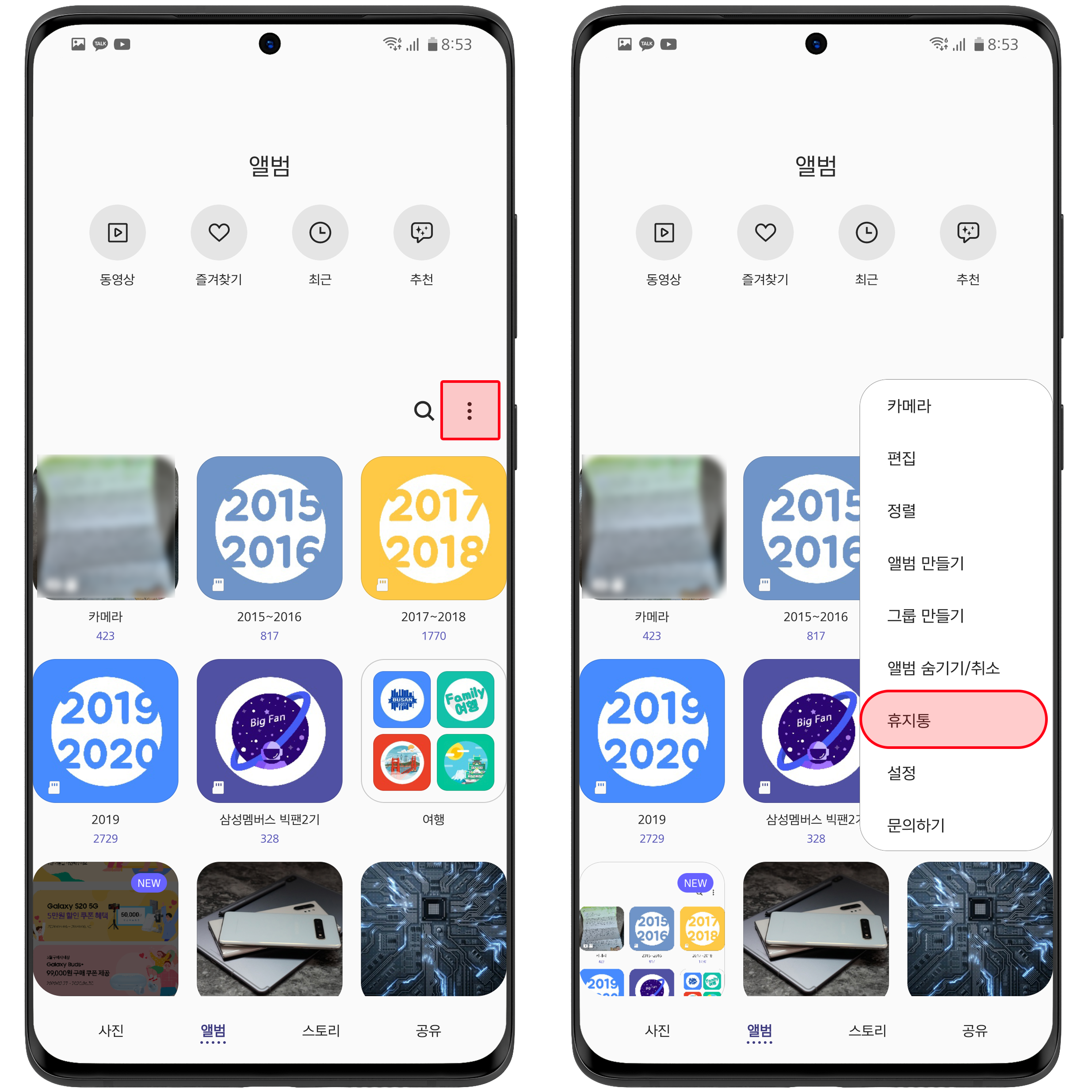 삼성 갤러리 앱을 진입 하신 후 우측 상단에 메뉴[︙]를 선택하신 후 휴지통 메뉴로 이동합니다.