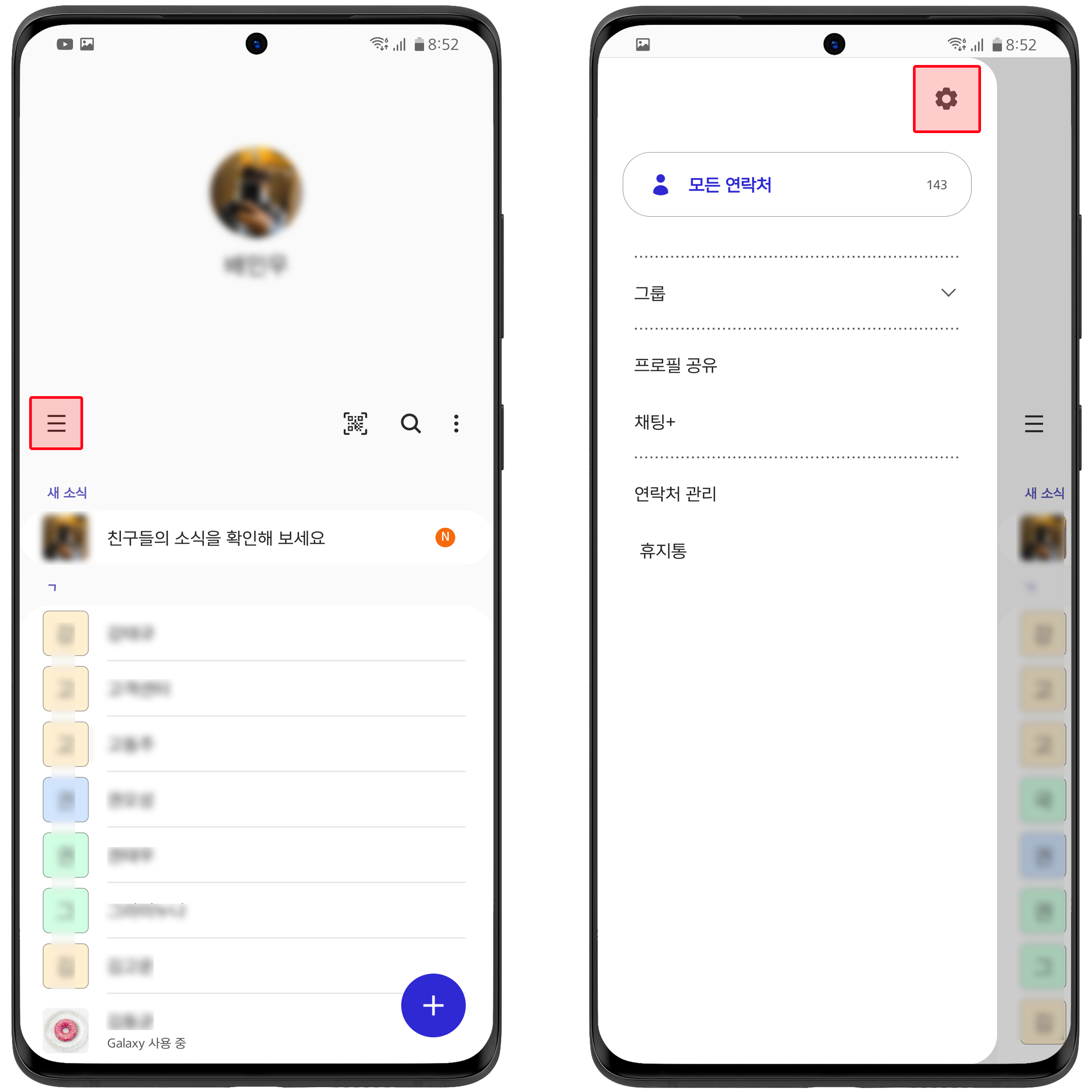 삼성 연락처 앱을 실행 하신 후 좌측 상단에 메뉴[≡]를 선택하시면 좌측 메뉴 레이아웃이 나타납니다.