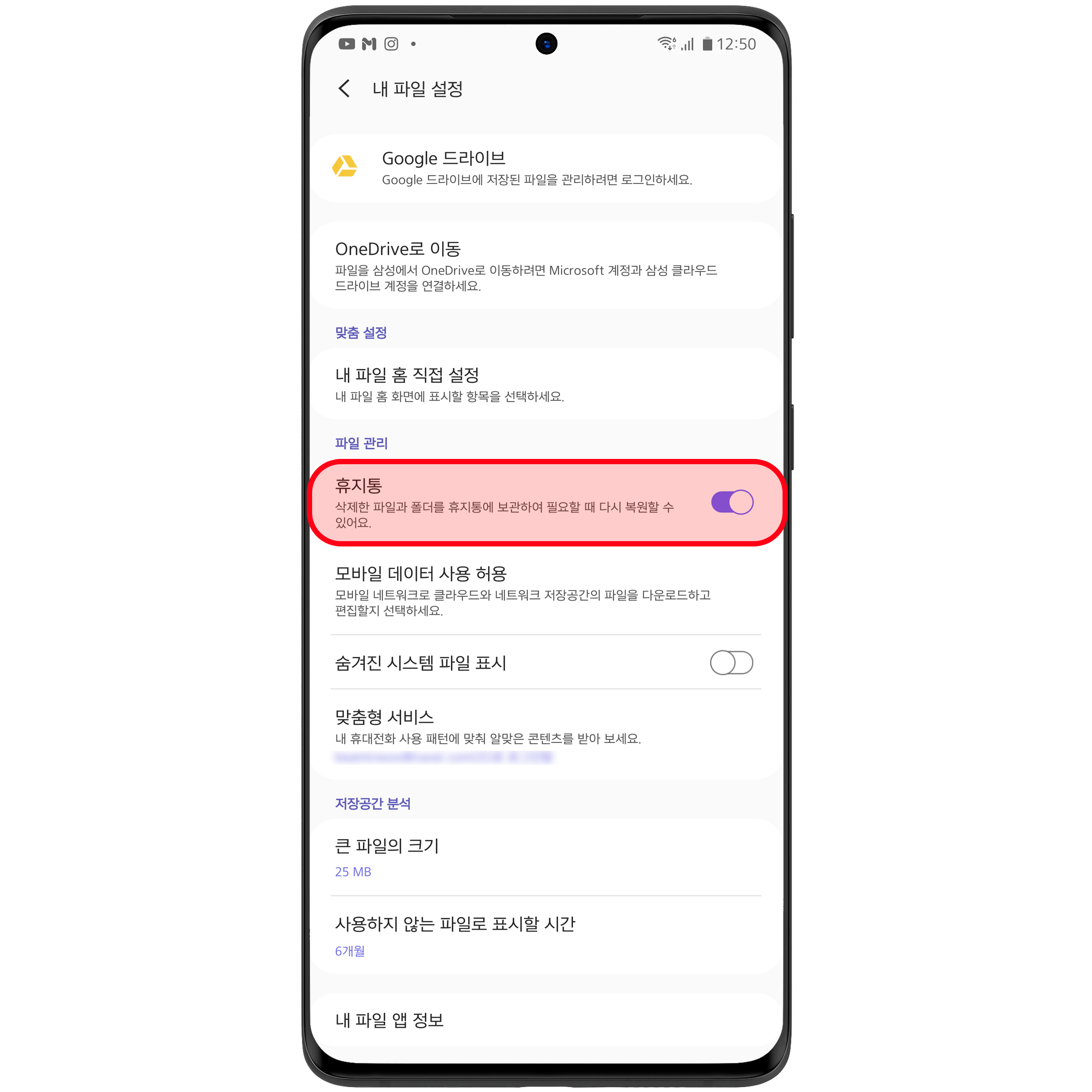 이동한 설정 메뉴 리스트 중에서 휴지통의 토글을 ON 하여 휴지통 기능을 활성화 해주세요.