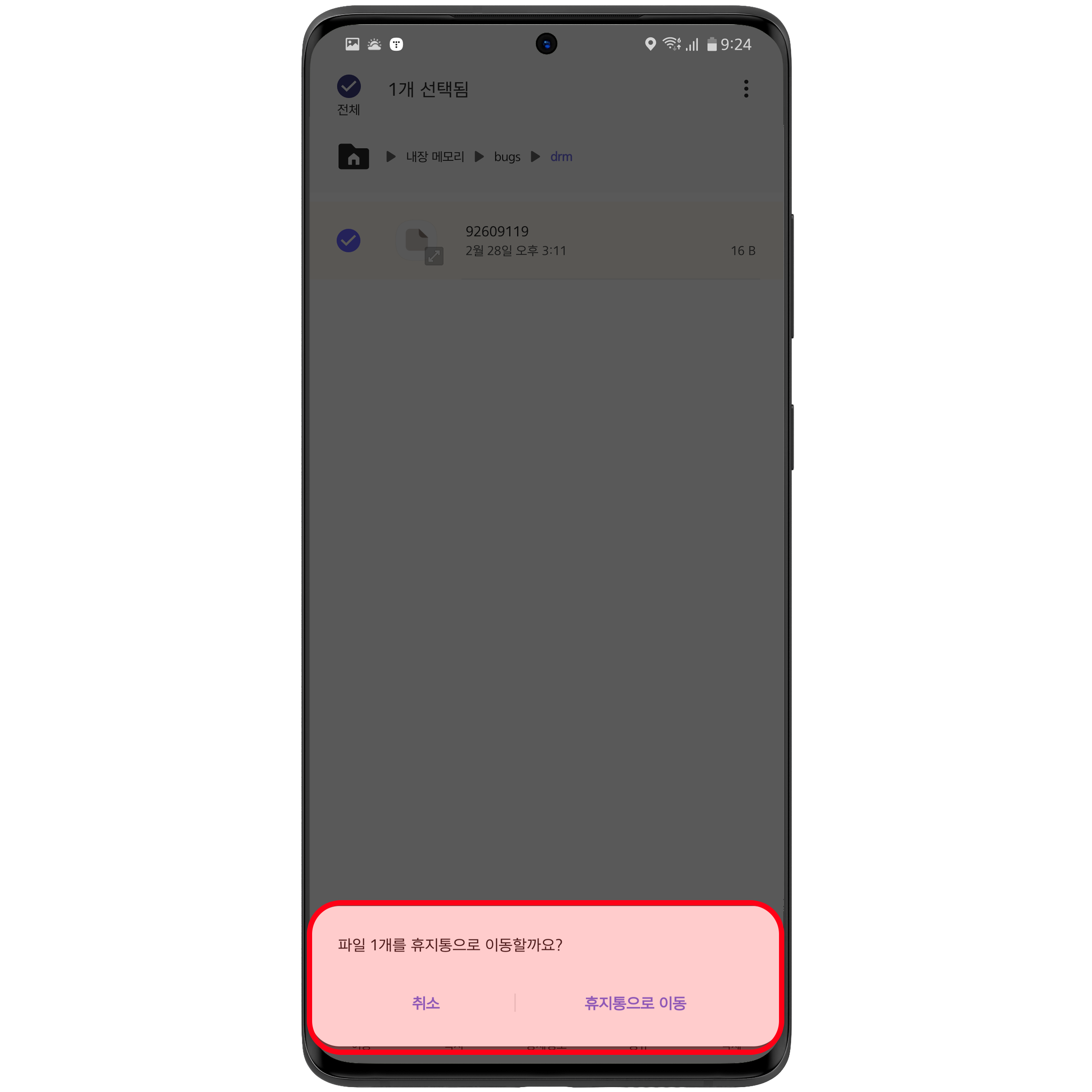 내파일 앱 내 파일을 삭제하기 전 휴지통으로 이동할 것인가 하는 팝업창이 나타나며, 휴지통으로 이동을 눌러 파일을 삭제하면 휴지통으로 이동을 합니다.