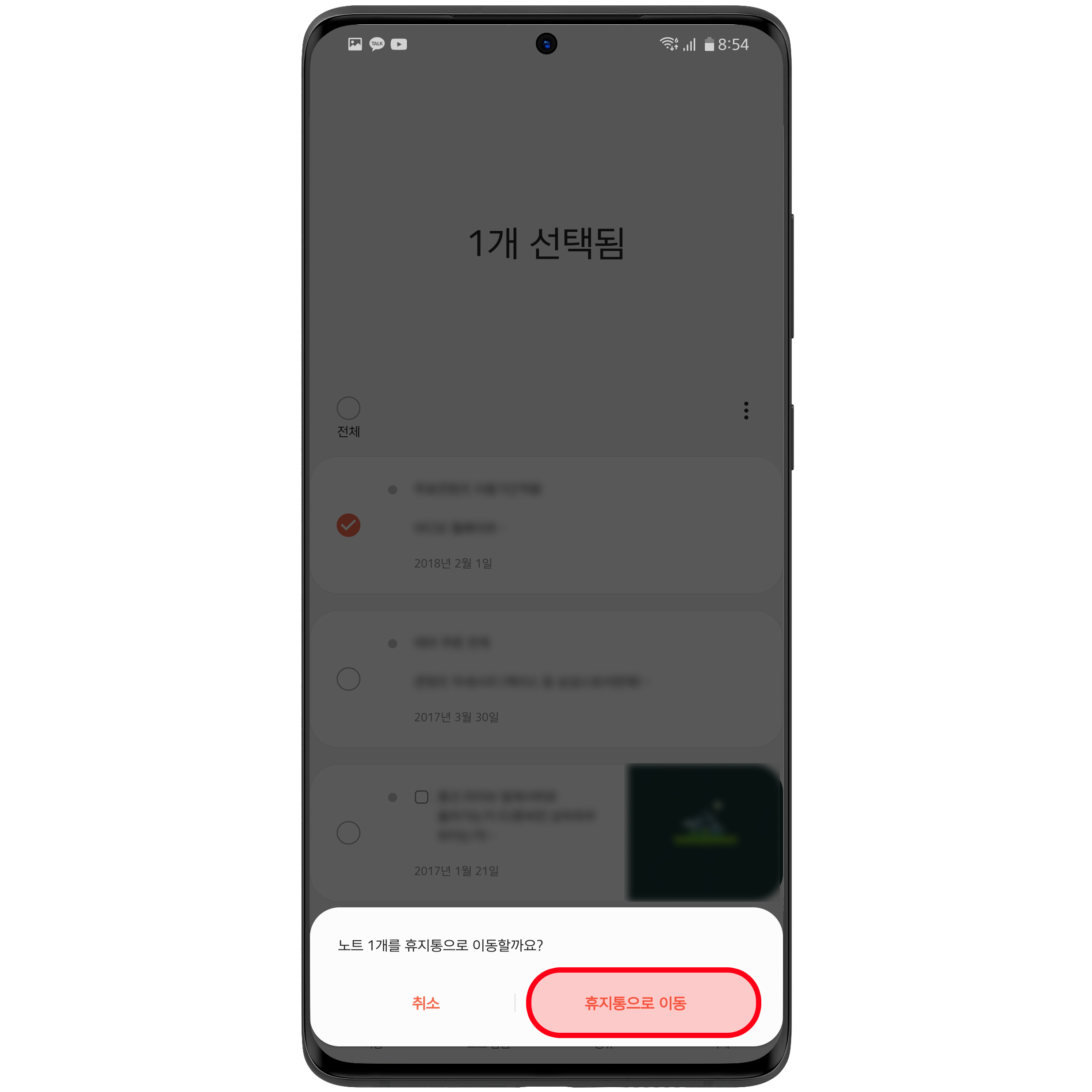 메모한 노트를 삭제하기 전 휴지통으로 이동할 것인가 하는 팝업창이 나타나며, 휴지통으로 이동을 눌러 노트를 삭제하면 휴지통으로 이동을 합니다.