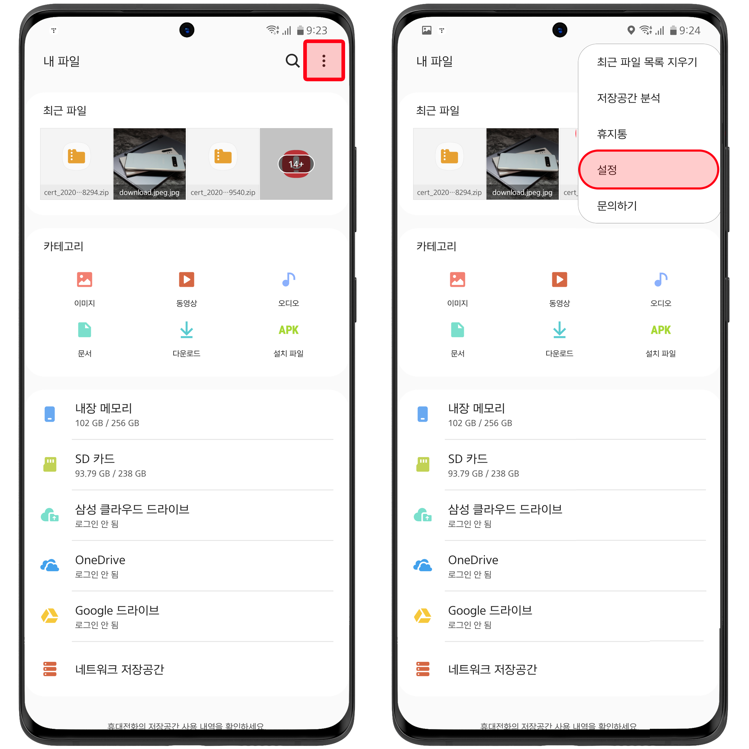 내 스마트폰의 사진과 영상 외에도 음악파일 apk파일 등 소중한 자료들을 가지고 있는 내파일도 휴지통 기능을 활성화 할 수 있습니다. 우측 상단에 메뉴[︙]를 눌러 [설정] 메뉴로 이동해줍니다.