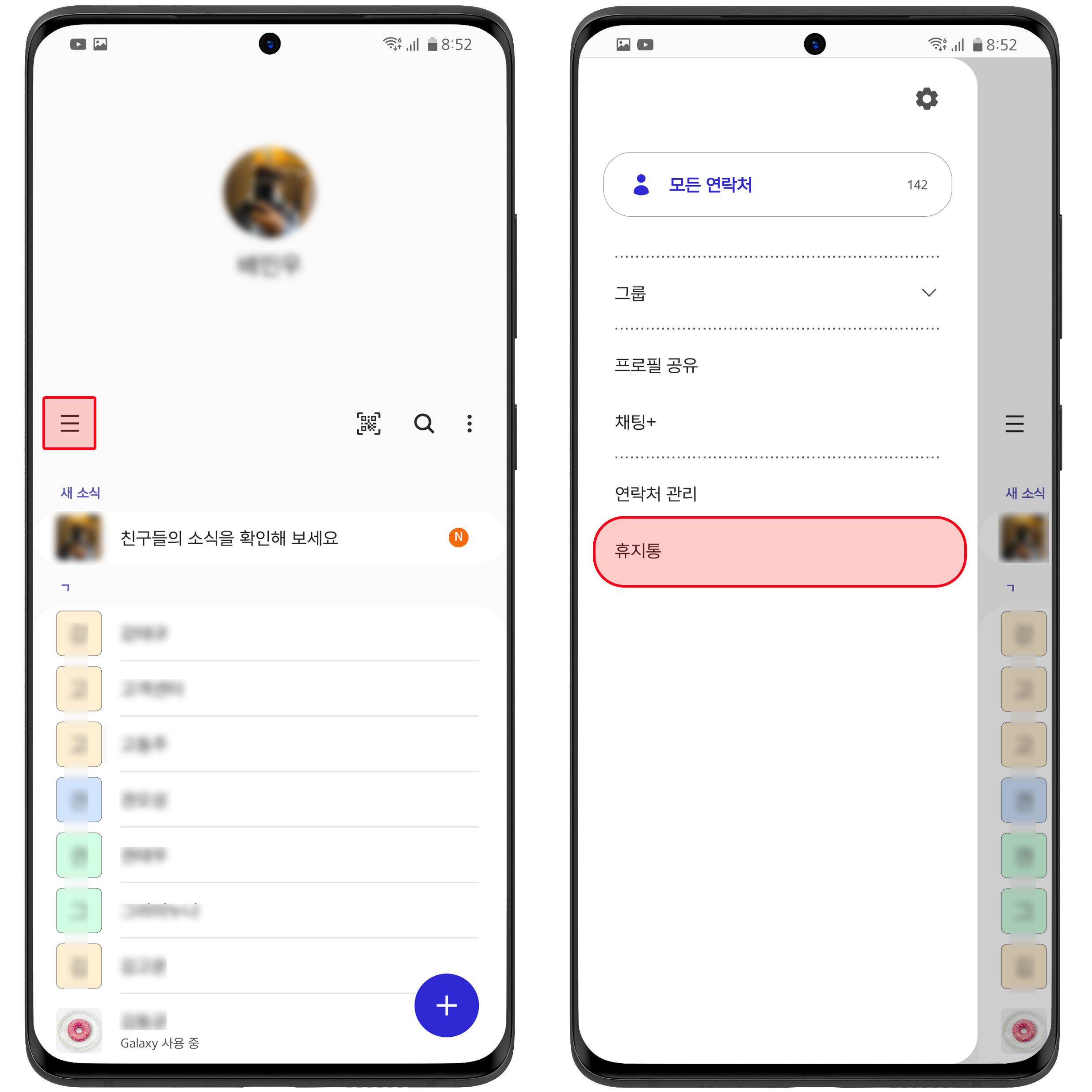 휴지통으로 삭제된 연락처를 확인하는 방법은 연락처 앱 좌측 상단에 메뉴[≡]를 눌러주신 후