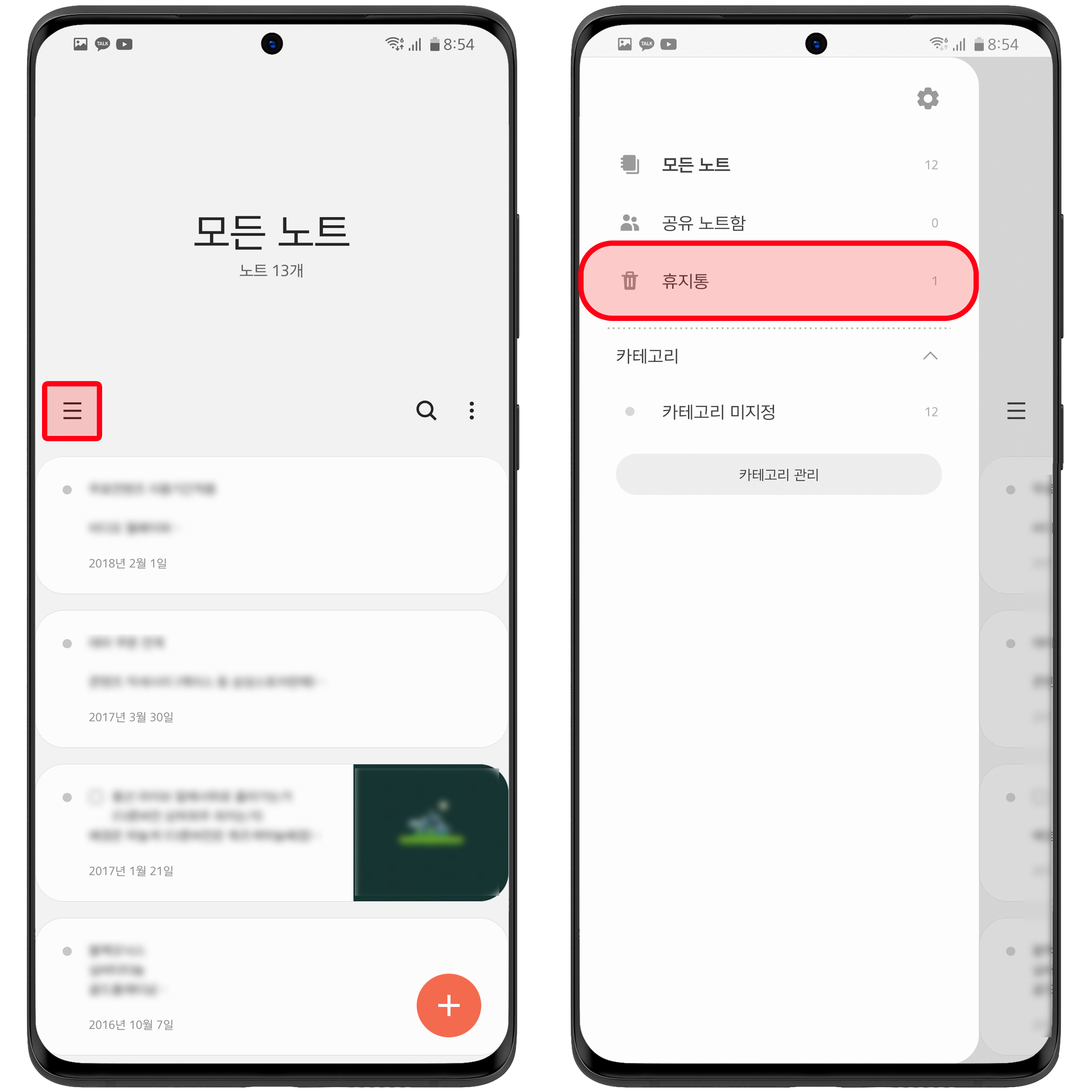 삼성 노트 앱을 실행하신 후 좌측 상단에 메뉴[≡]를 눌러 세부메뉴로 이동합니다.