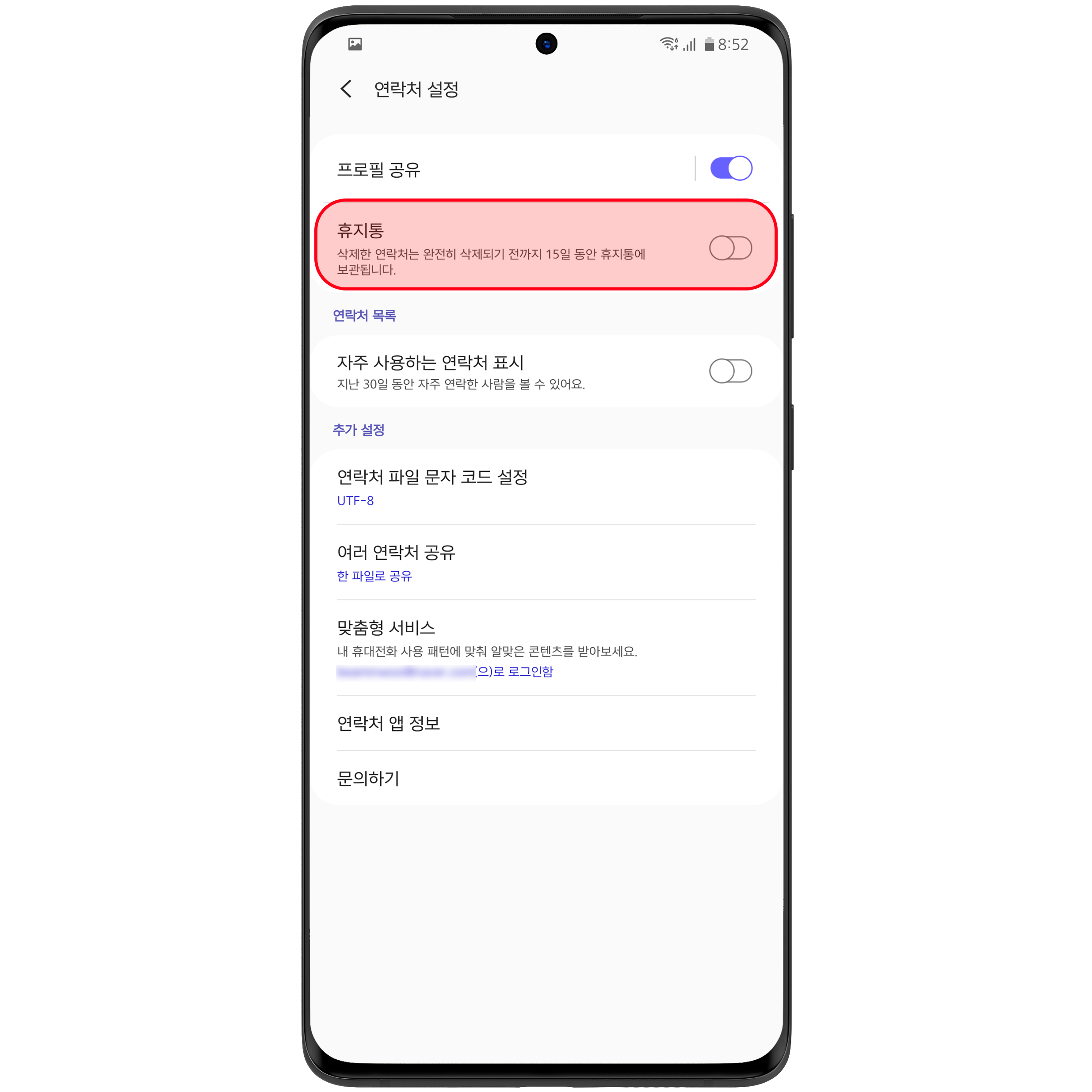 연락처 설정 메뉴로 이동하신 후 보이는 메뉴 중 [휴지통] 메뉴를 토글바를 이용하여 ON 하여 활성화 시켜줍니다.