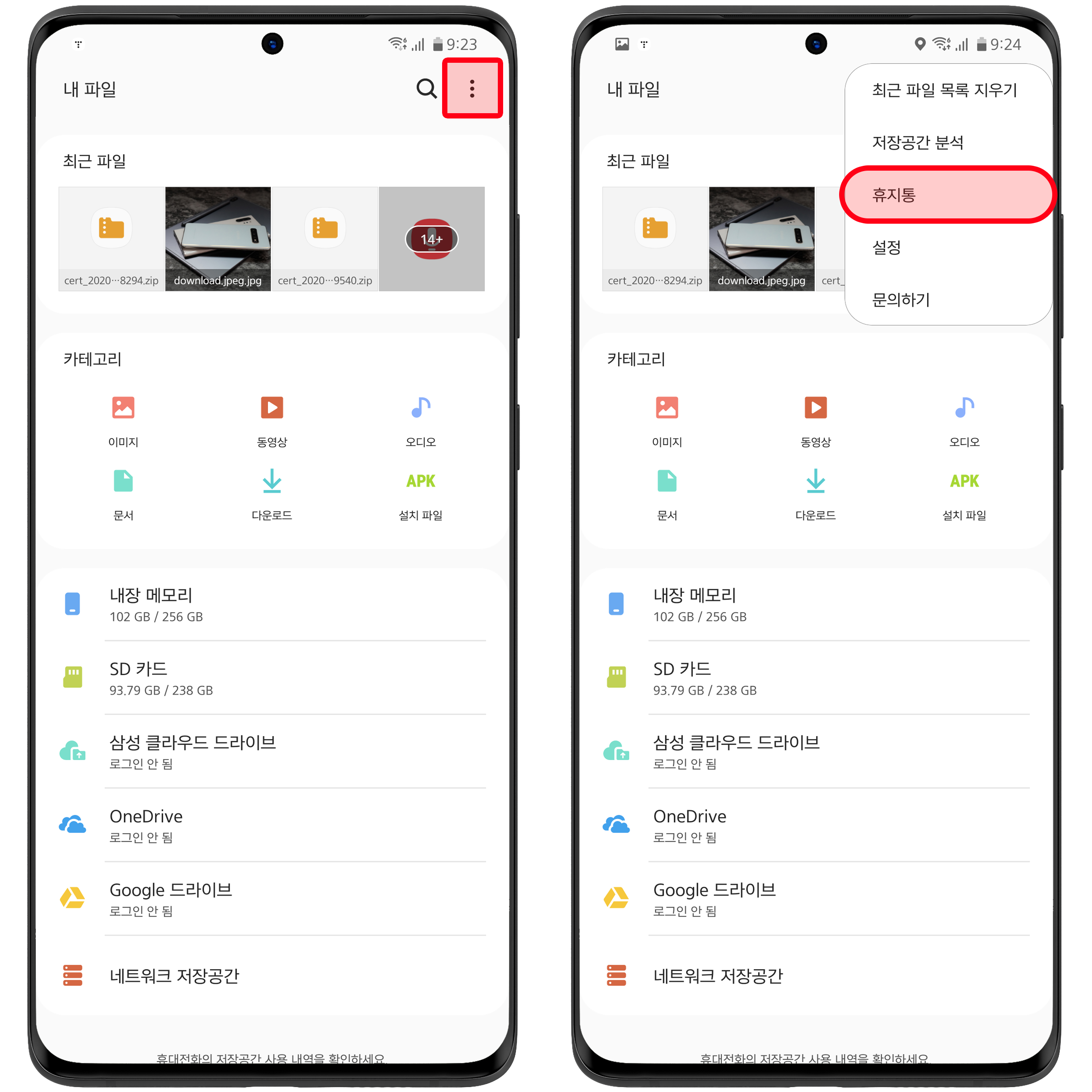 우측 상단에 메뉴[︙]를 눌러 [휴지통] 메뉴로 이동해줍니다.