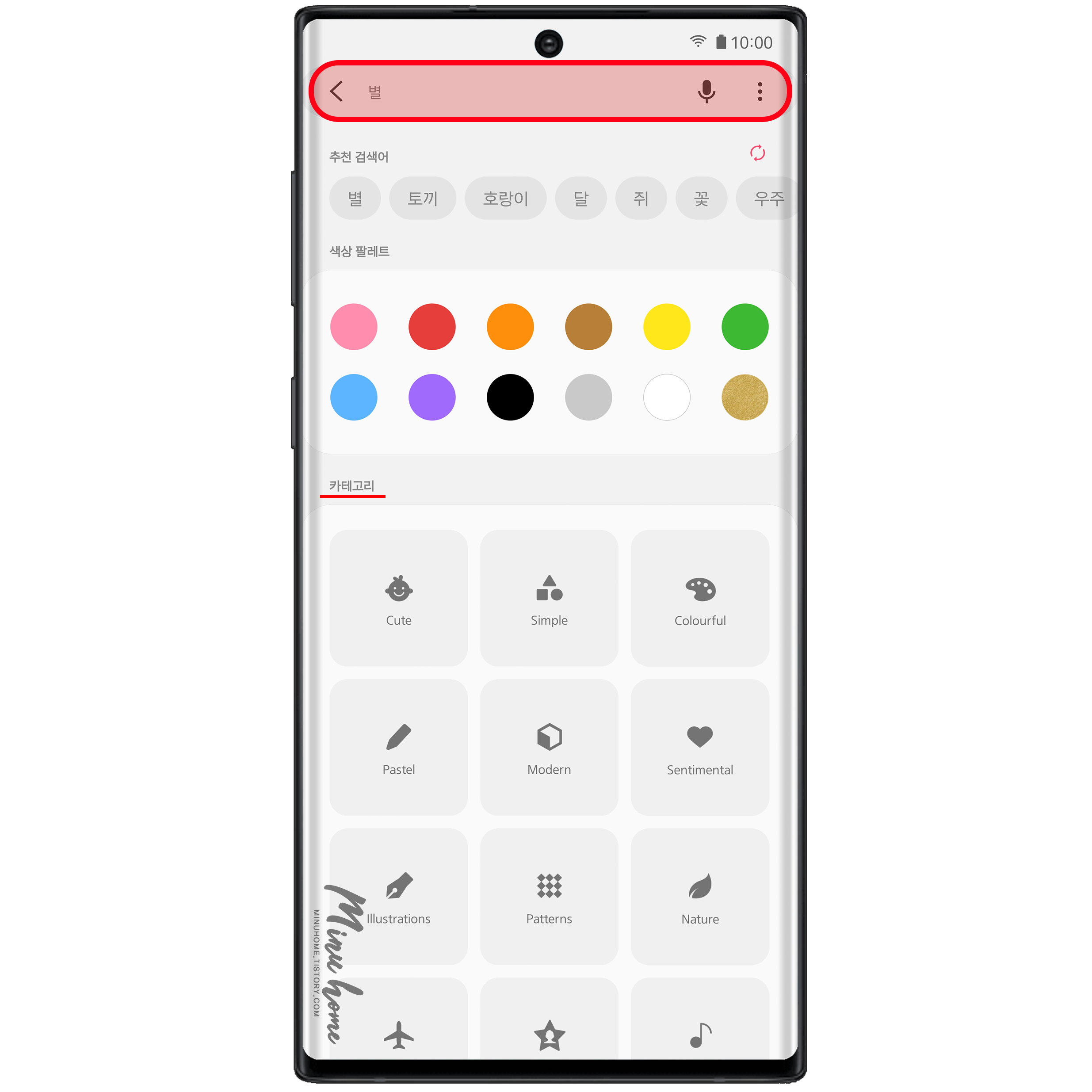 해당 돋보기를 통해 검색 레이아웃으로 이동하면 검색창과 추천 검색어 그리고 하단에는 카테고리와 색상 팔레트가 존재합니다.