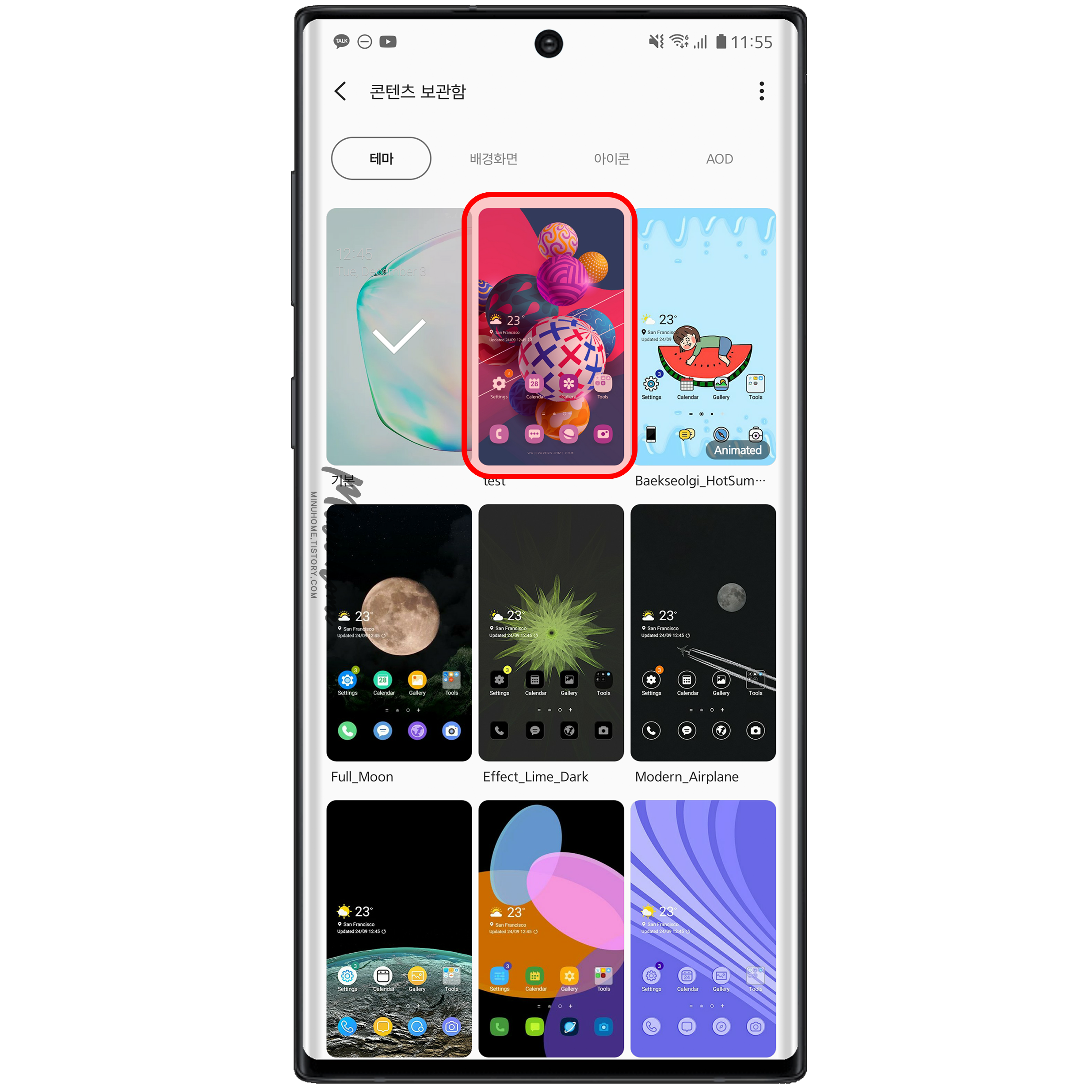 테마를 설치하면 갤럭시 테마 목록에 내가 테마파크를 통해 만든 테마가 제작된 것을 볼 수 있습니다.