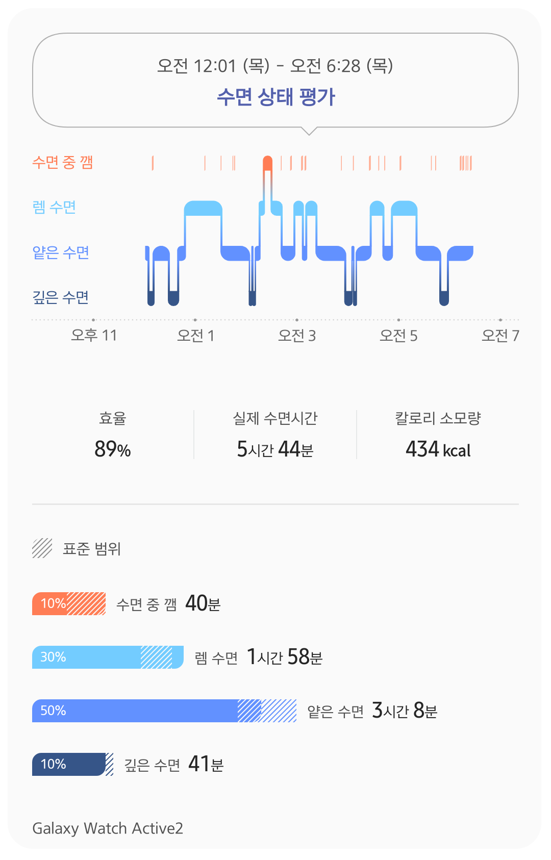 깊은수면은 41분 정도이고 중간중간에 얕은 수면인 경우가 많네요 :(