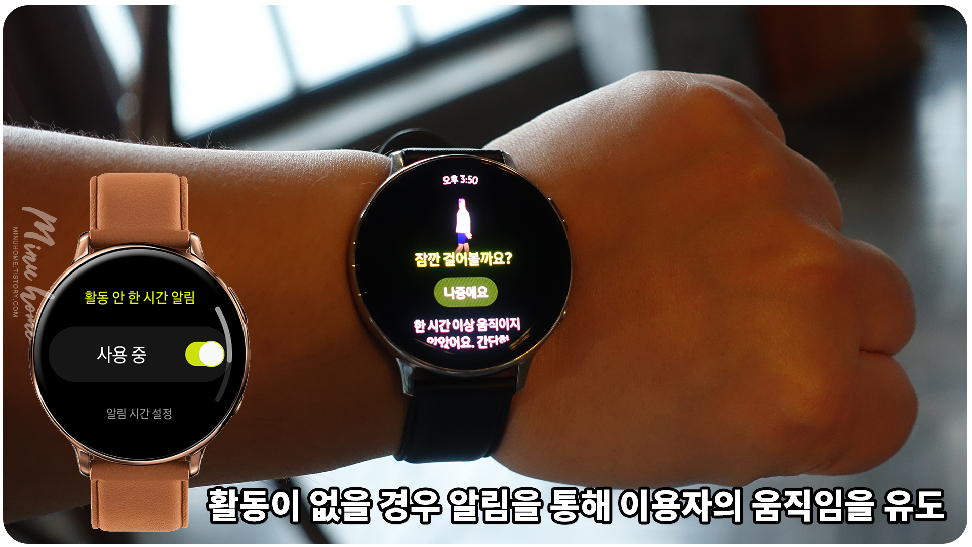 갤럭시 워치 액티브2를 착용하고 장시간 움직임이 없을 때는 자동으로 알아서 활동 안 한 시간을 알려줍니다.