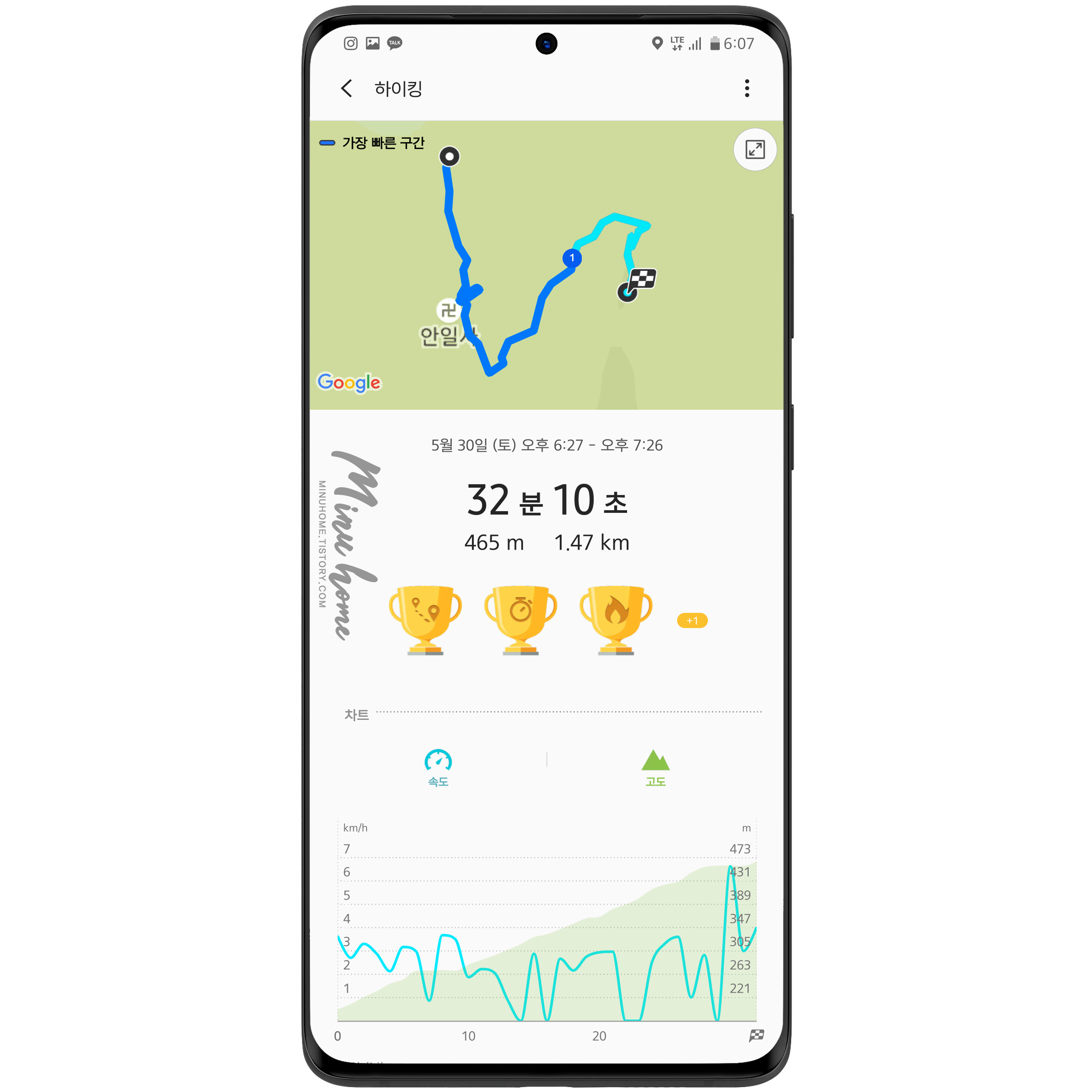갤럭시 워치 액티브2에 운동하기를 통해 수동으로 하이킹을 측정하면 GPS와 함께 이동 구간이 기록되며, 고도와 속도 그리고 구간별 평균 속도를 측정해 기록해줍니다.