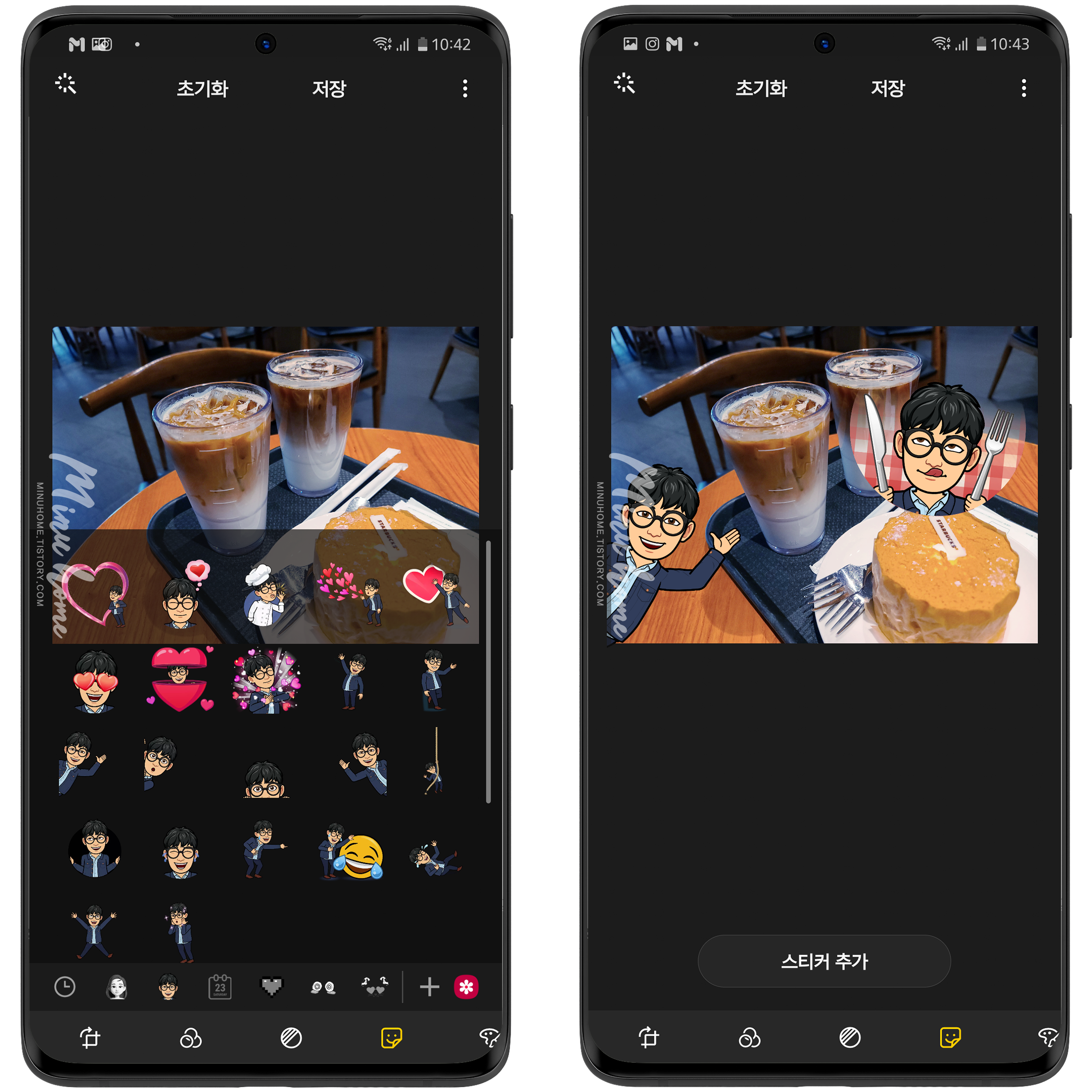 생성된 Bitmoji는 삼성키보드 와 포토에디터에서 사용이 가능합니다, 포토에디터의 하단 탭바에서 스티커 메뉴로 이동하면 Bitmoji를 사용할 수 있습니다.