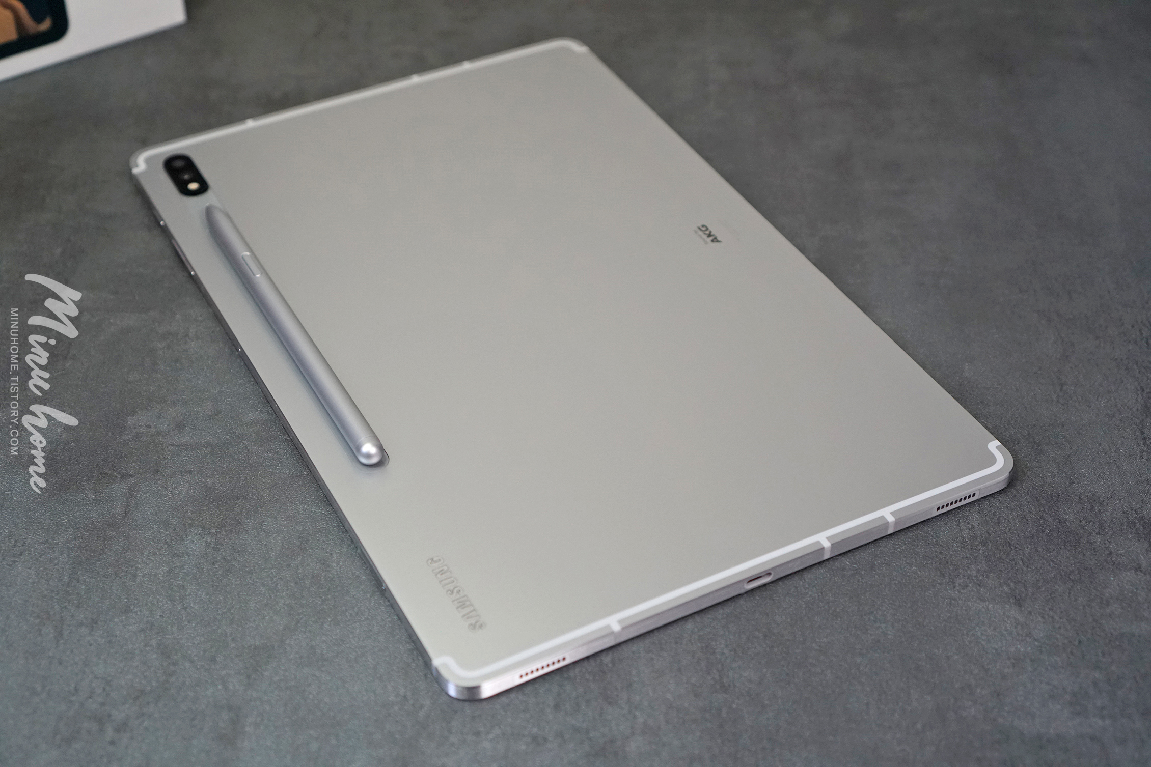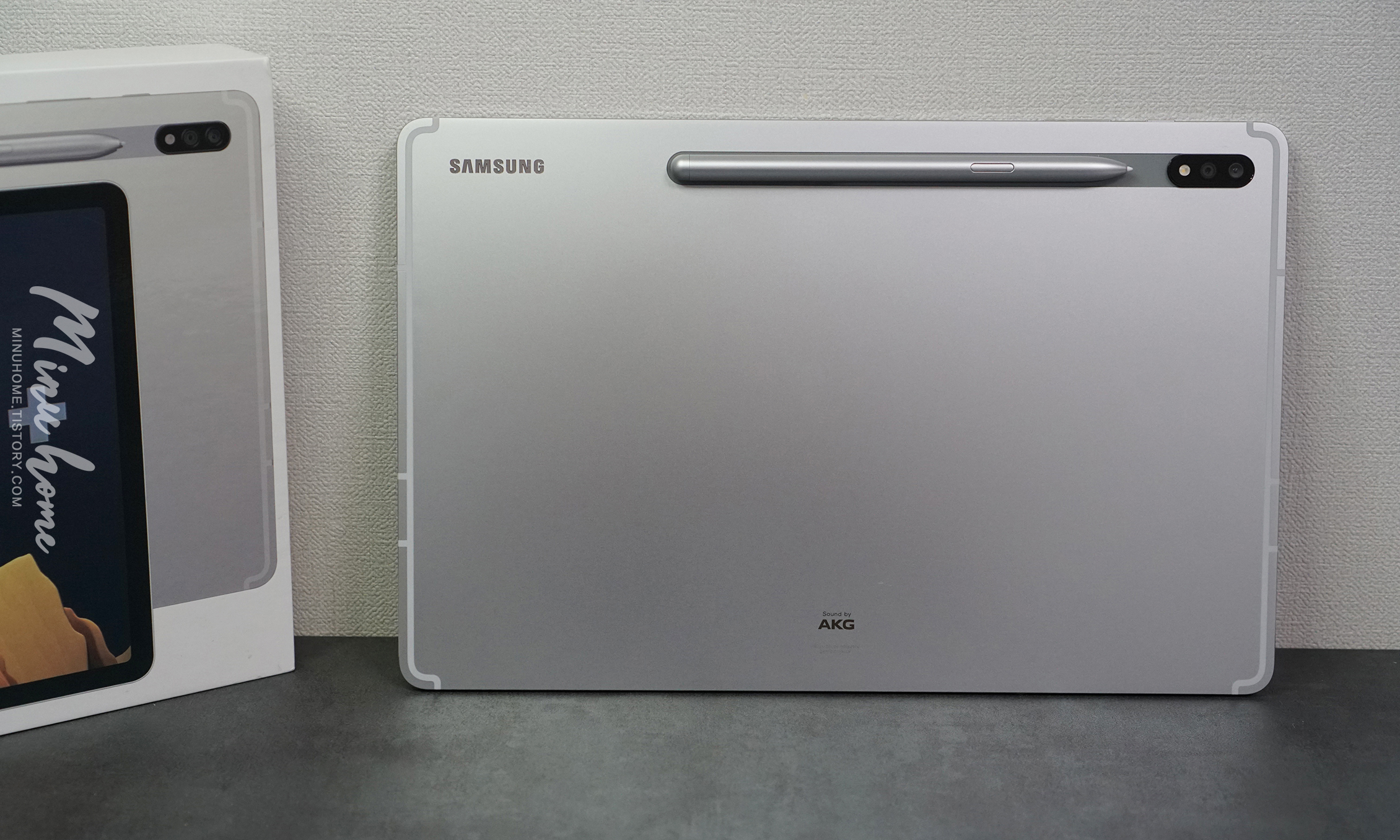이번 갤럭시 탭S7은 가로모드에 최적화 되어있기때문에 후면부 디자인도 삼성로고와 AKG로고가 가로모드에 최적화 되어 각인된 것을 볼 수 있습니다.