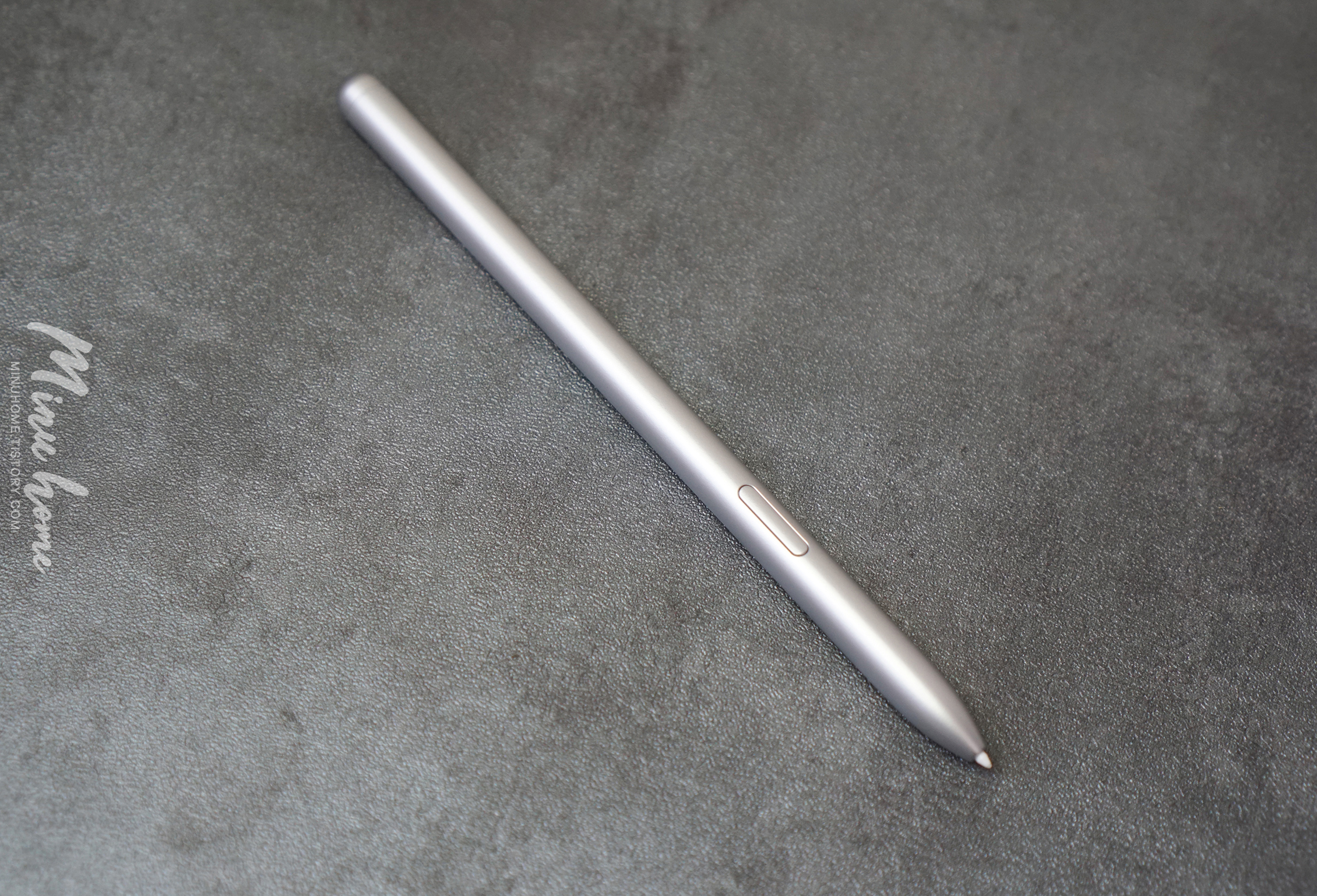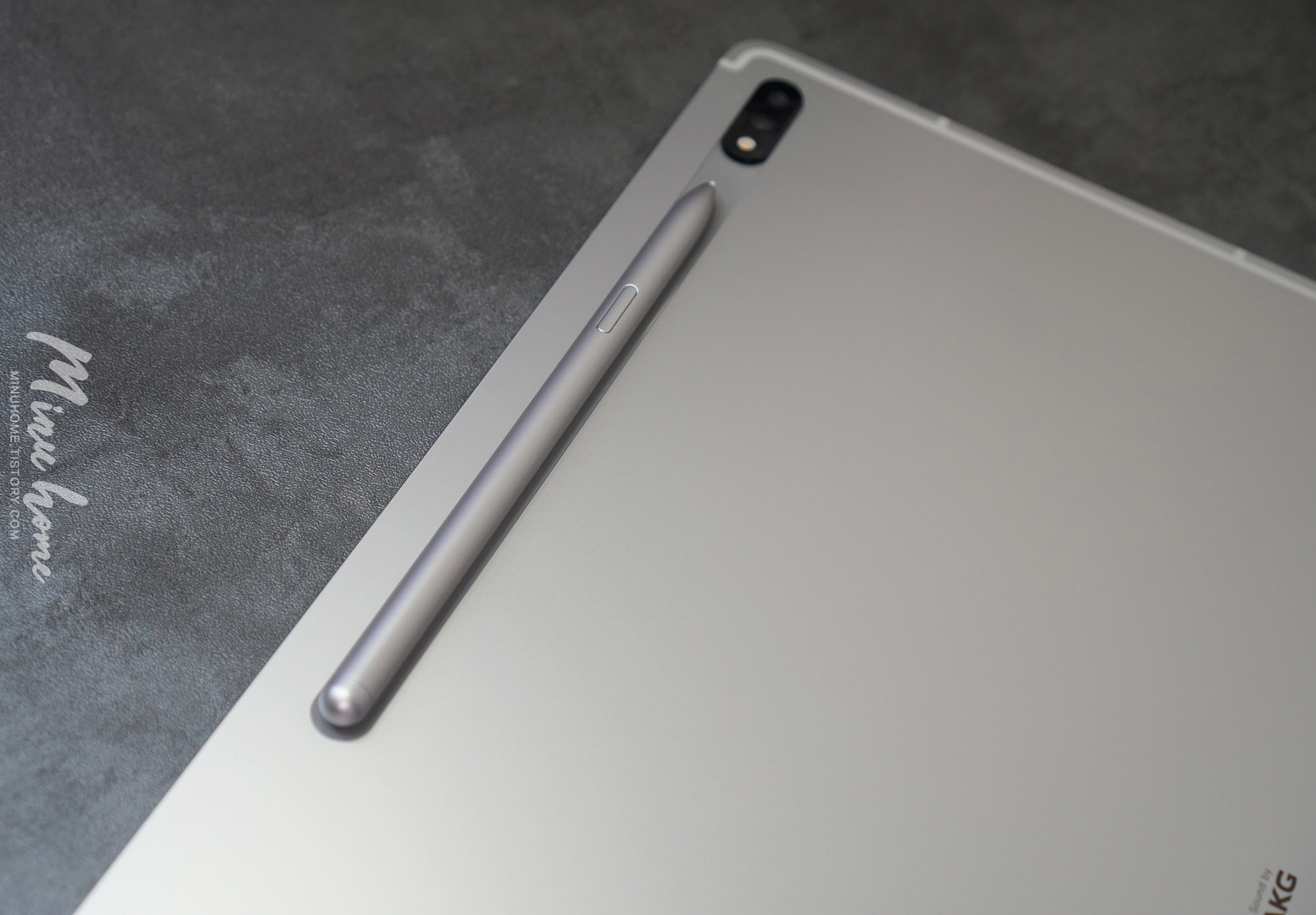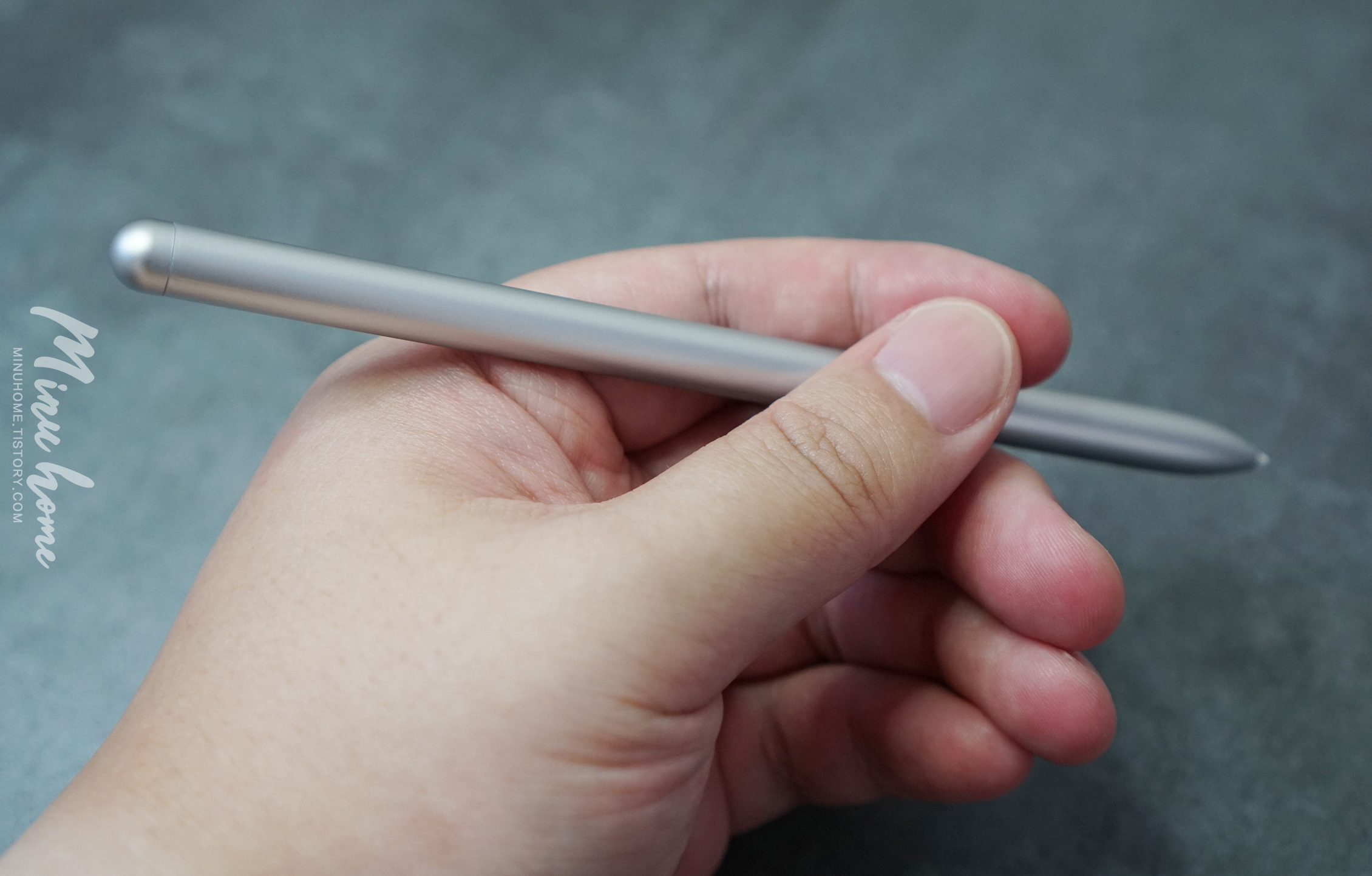 갤럭시 탭S7 플러스의 S펜은 탭S6 라이트와 펜 모양과 크기가 비슷했습니다. 연필처럼 파지했을 때 편안함을 보여주었고 둥글둥글한 모습을 보여줍니다.