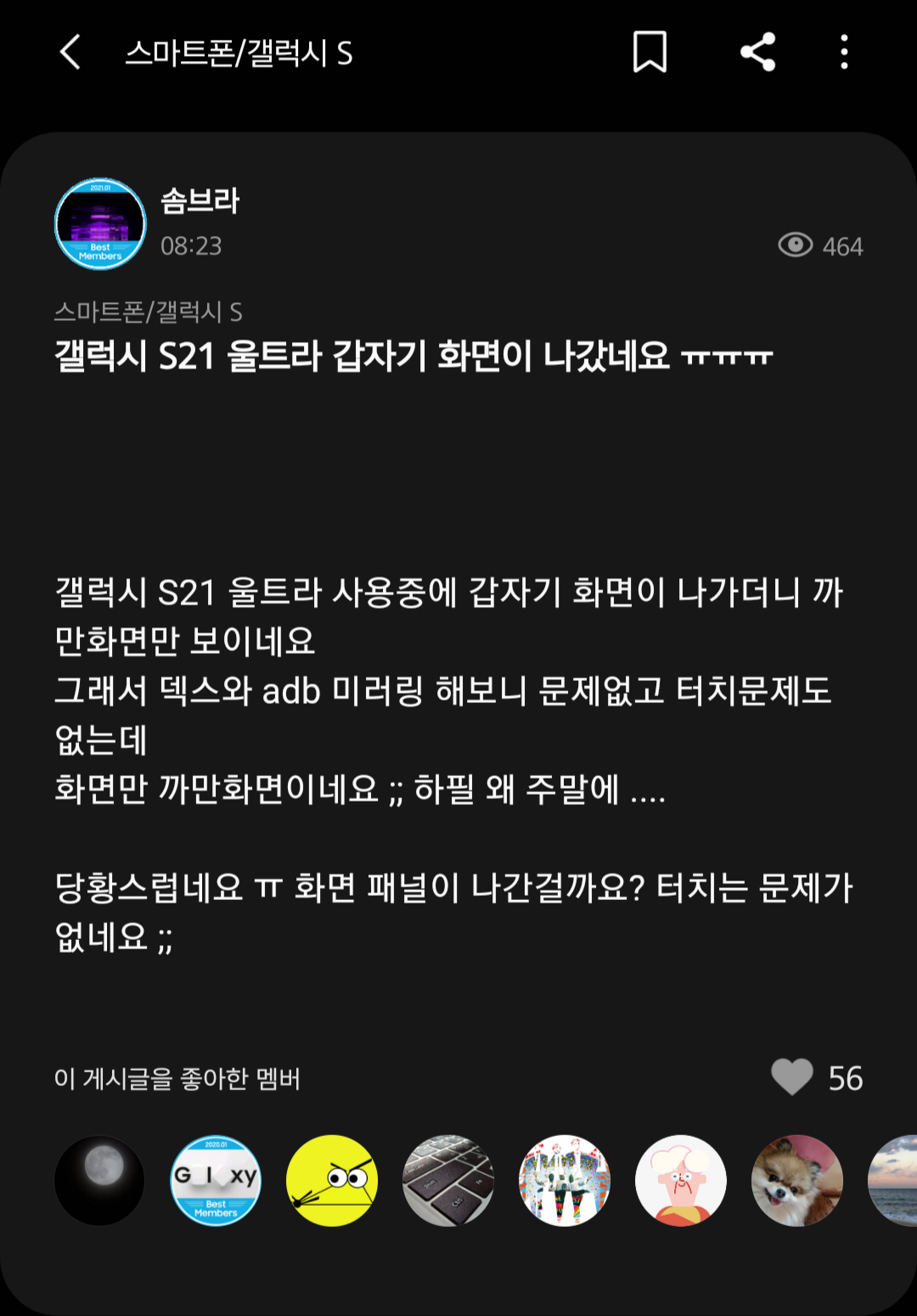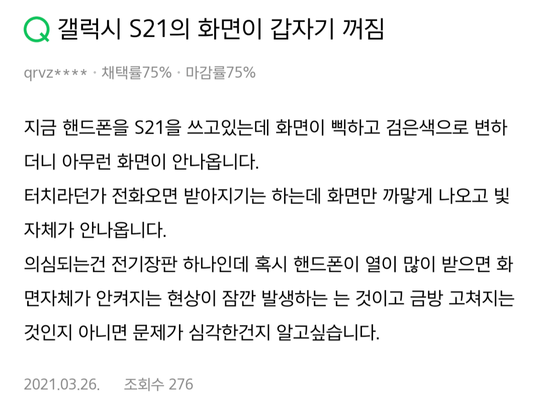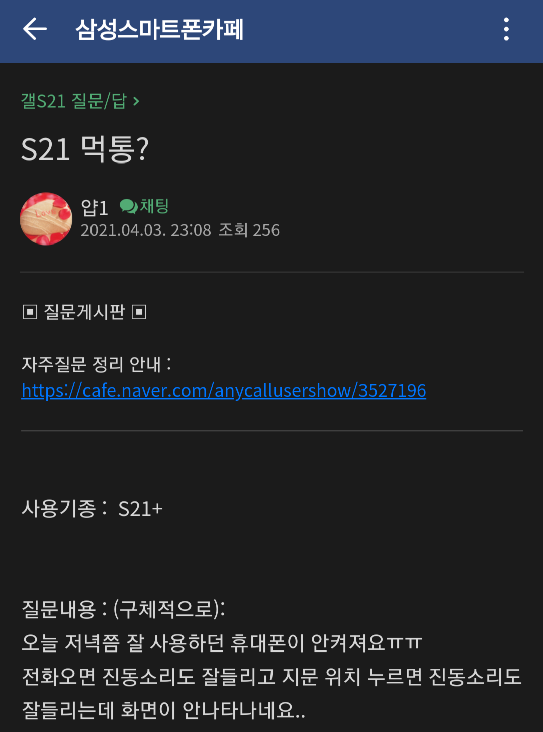 갤럭시 제품을 사용하면서 이유없이 화면이 나가버리거나, 패널이 나가서 까만화면이 보여지는 증상이 최근 커뮤니티에 많이 올라오고 있습니다.