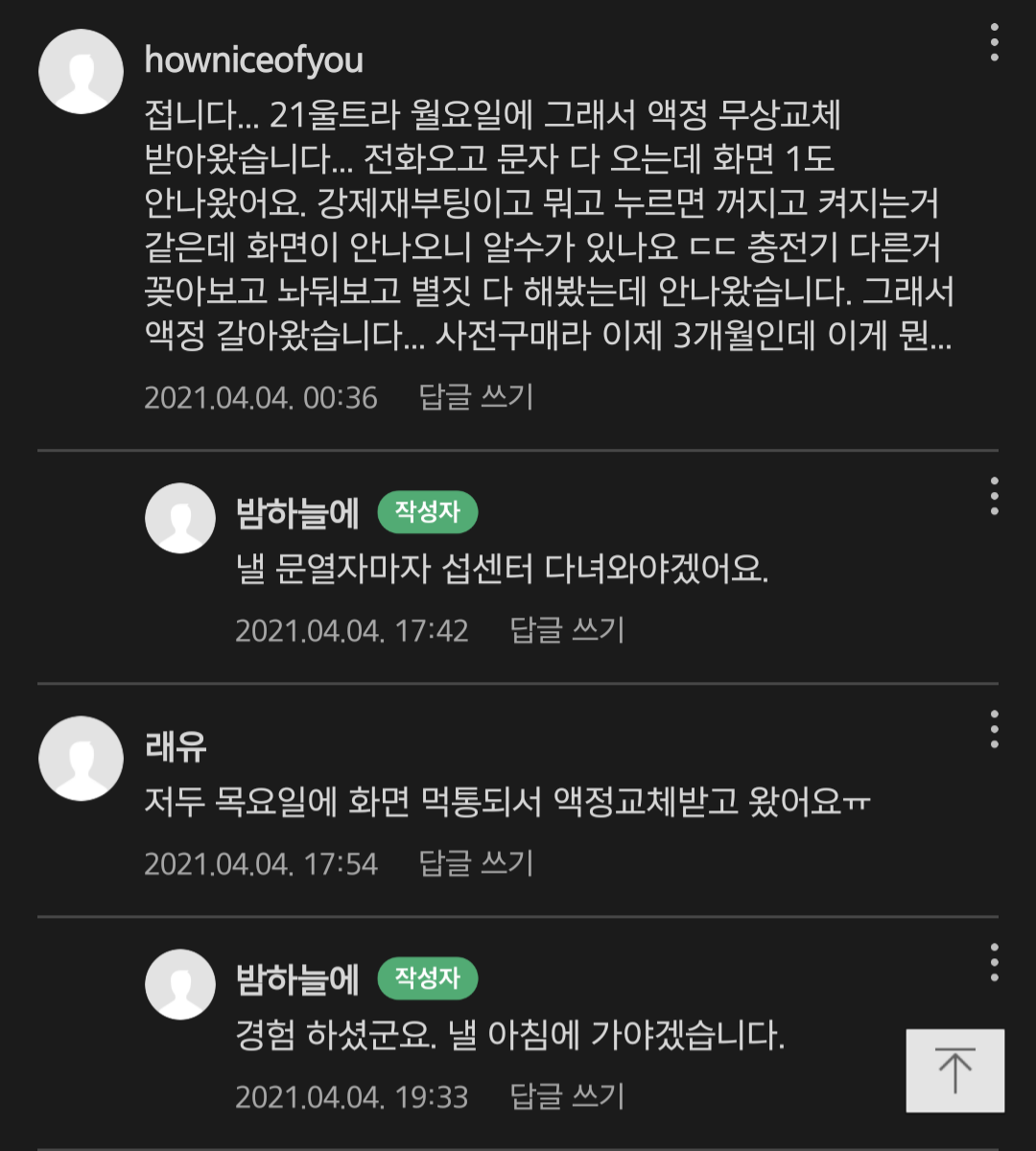 제품 사용자의 공통점은 사용 중 갑자기 화면이 꺼져버린거 처럼 화면이 까만색으로 변하는게 공통점입니다.