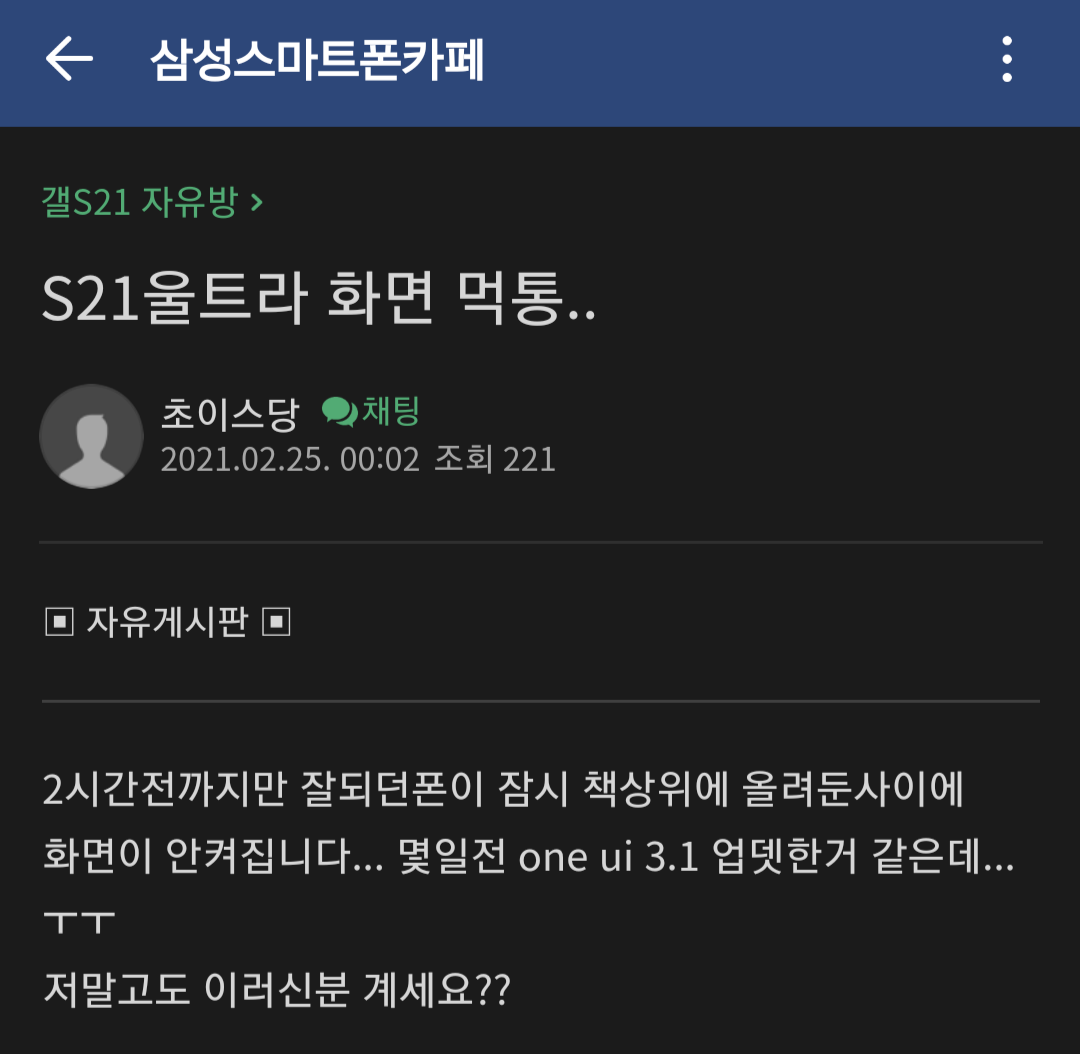ONE UI 3.1의 문제일까? 대부분 이용자는 ONE UI 3.1 업데이트 이후 해당 증상이 발생했다는 내용이 대부분이었습니다.