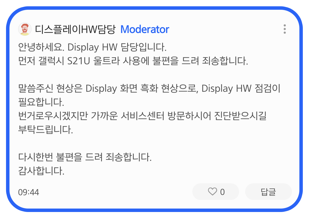 해당 문제점에 대해 삼성전자의 공식적인 입장이나, 해당 화면에 대한 보상 방안을 서비스센터를 통해 공문으로 안내를 꼭 해주면 좋겠습니다.