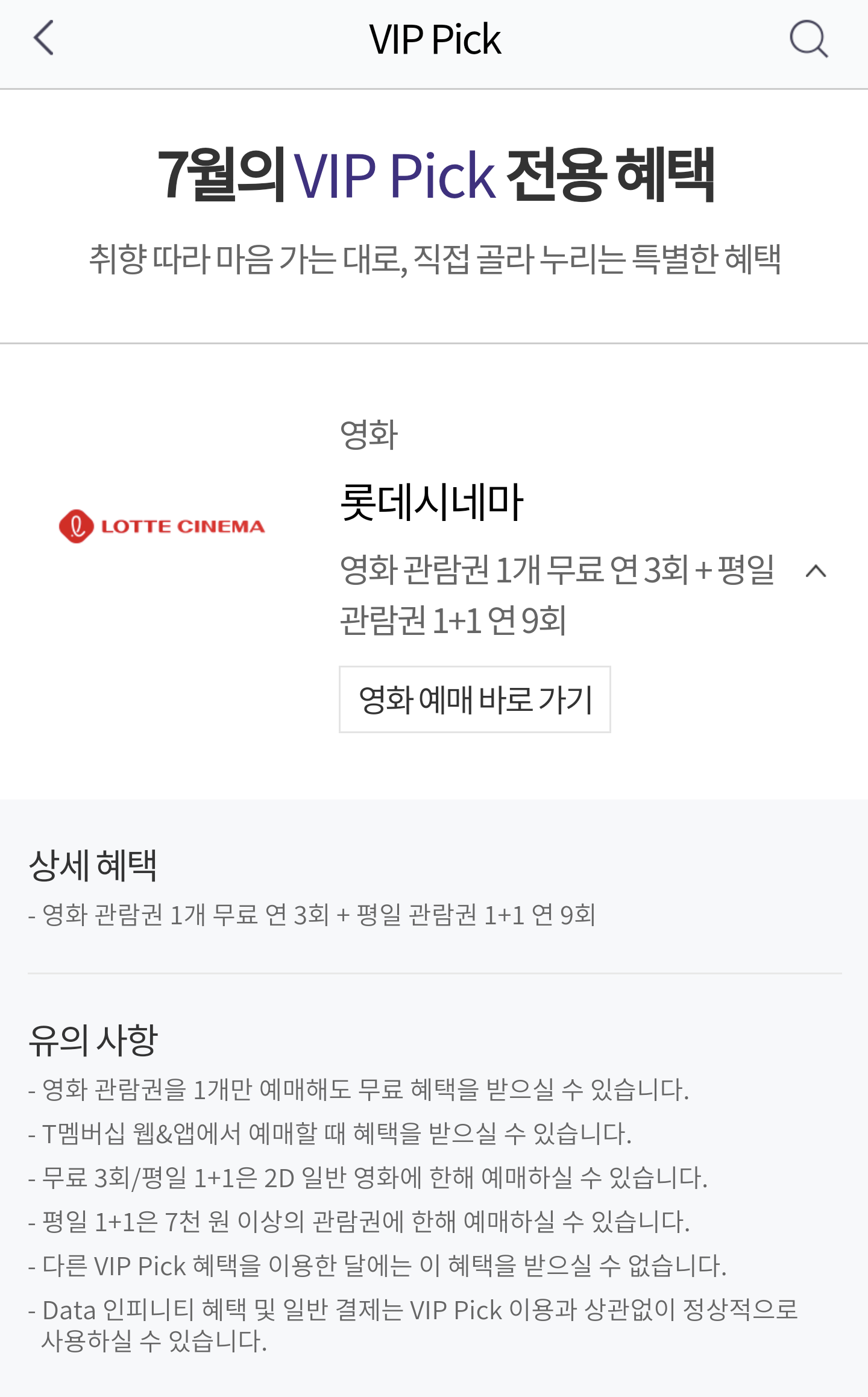 지난해까지 SKT T멤버십 VIP 회원은 VIP PICK 이용 횟수 소진 시 CGV, 메가박스, 롯데시네마 중 한군데를 골라 최대 1000원의 할인을 받을 수 있었지만 개편안 에서는 롯데시네마에서만 최대 3500원을 할인 받을 수 있게 변경했고
