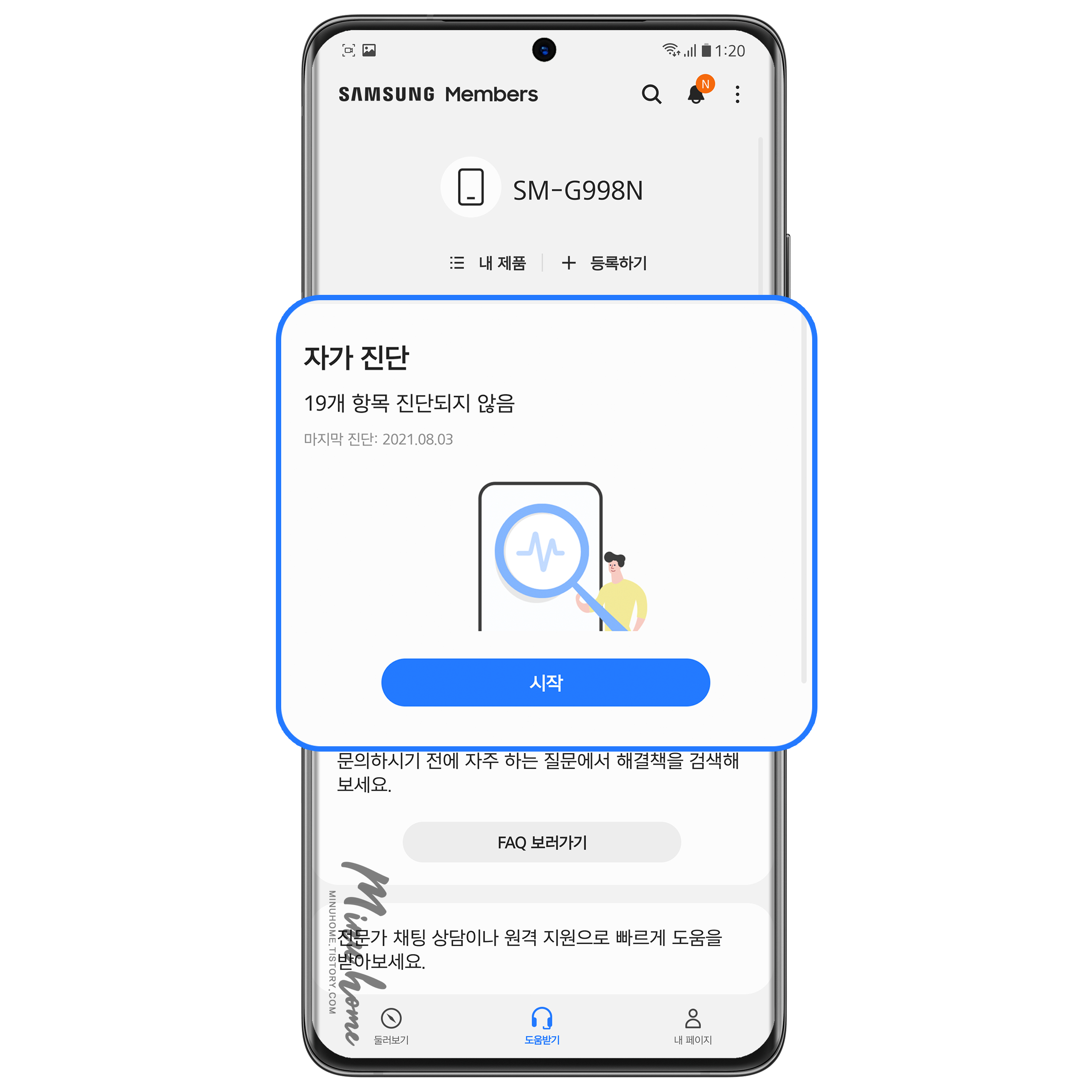 삼성멤버스 앱 하단 탭에서 도움받기 항목에서 "자가진단"을 할 수 있습니다.