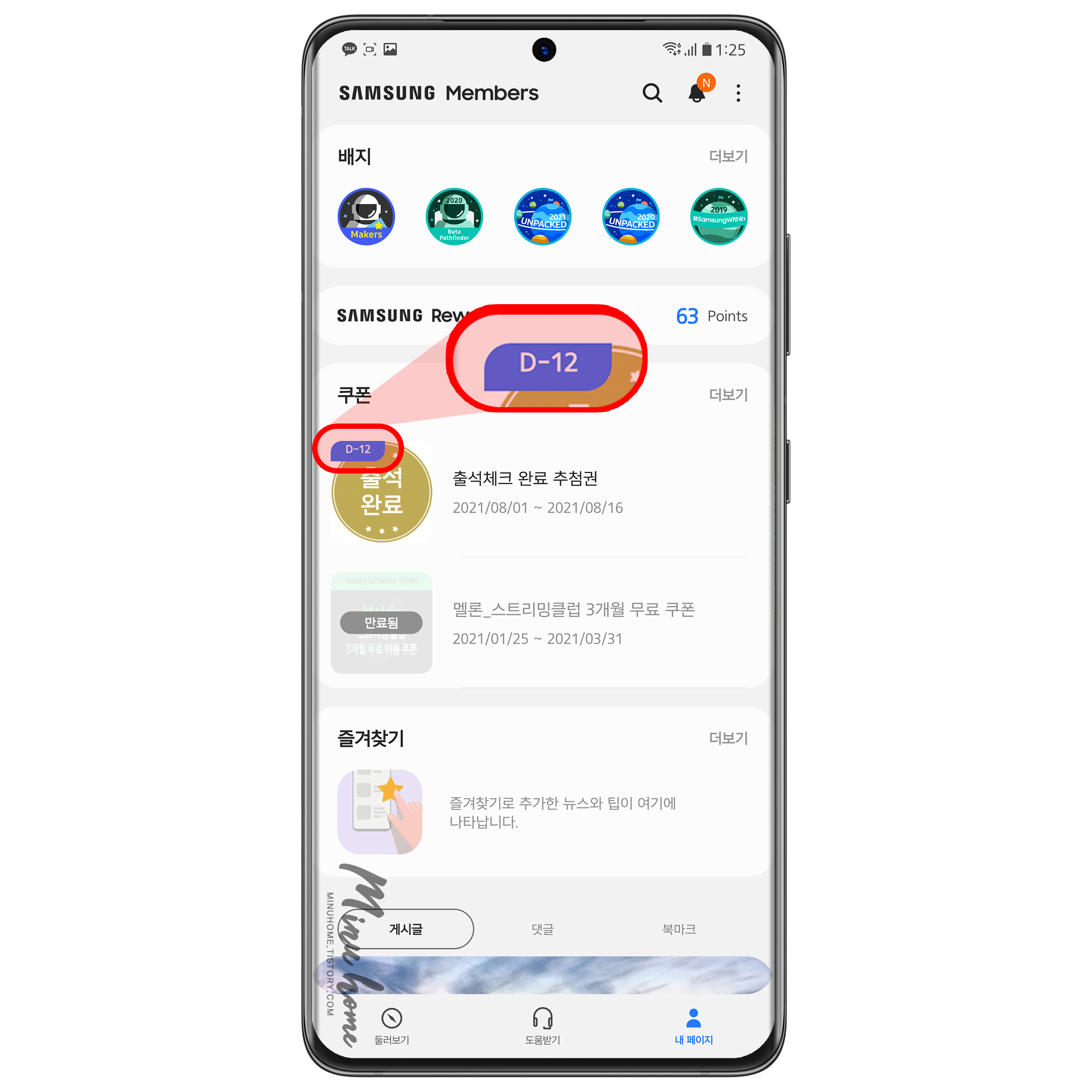 삼성멤버스를 통해 진행한 이벤트프로모션 쿠폰 혹은 제품 구매 후 사은품으로 증정된 프로모션 쿠폰의 남은 기간이 만료일 31일 이하루 남았을 때 부터 남은 날짜를 보여줍니다 사용하지 않은 쿠폰이 있다면 기간을 확인하여 빠르게 사용해주세요~