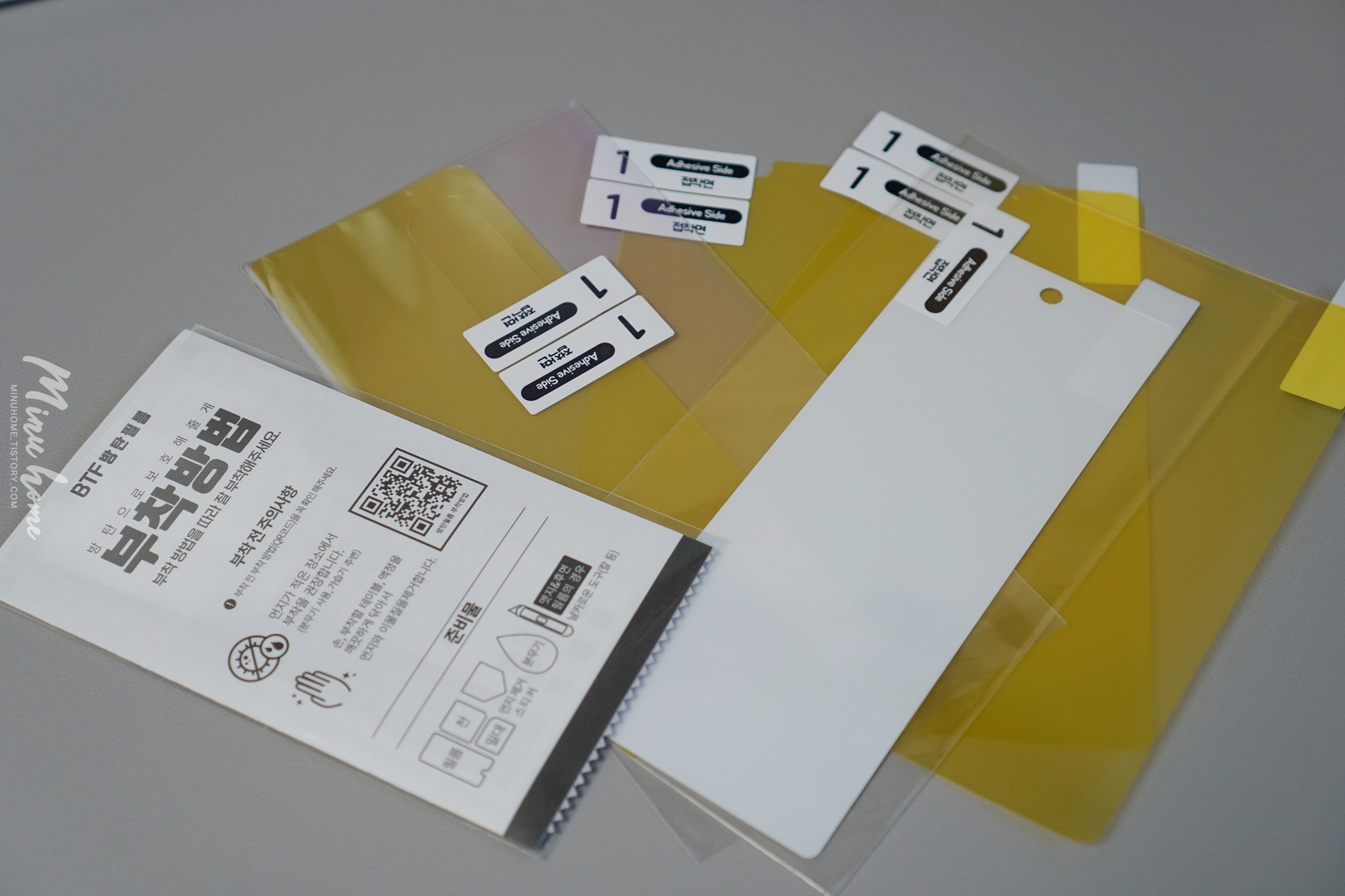 제품의 구성품은 전면 보호필름 1매, 내부2매 그리고 현재 진행중인 이벤트에서 증정하는 후면 보호필름이 있습니다.