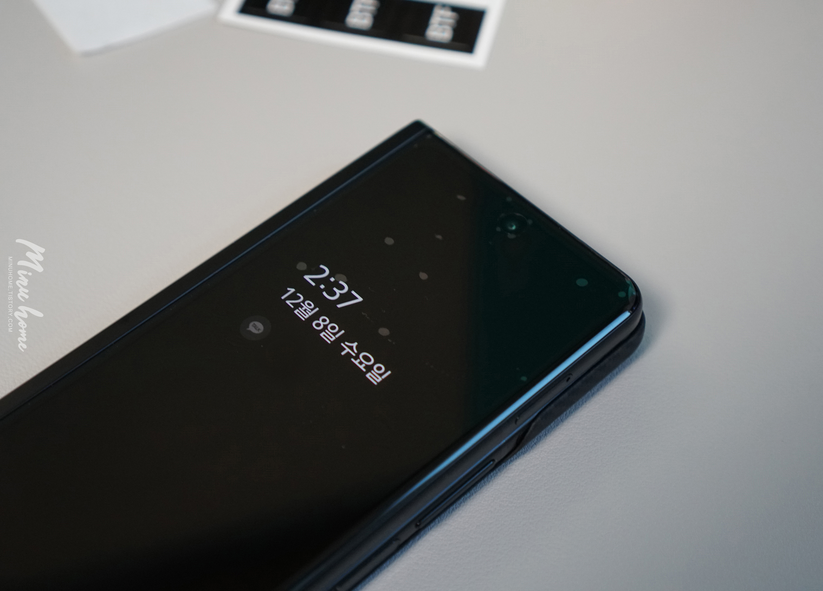 필름을 부착한 후 모습입니다, 전체적으로 풀 커버를 보여주고 있으며 초고압축을 통해 제작 된 필름이기 때문에 생각보다 펀치홀 부분의 필름으로 카메라 주변 필름 두께감이 두꺼워보이지는 않았습니다.