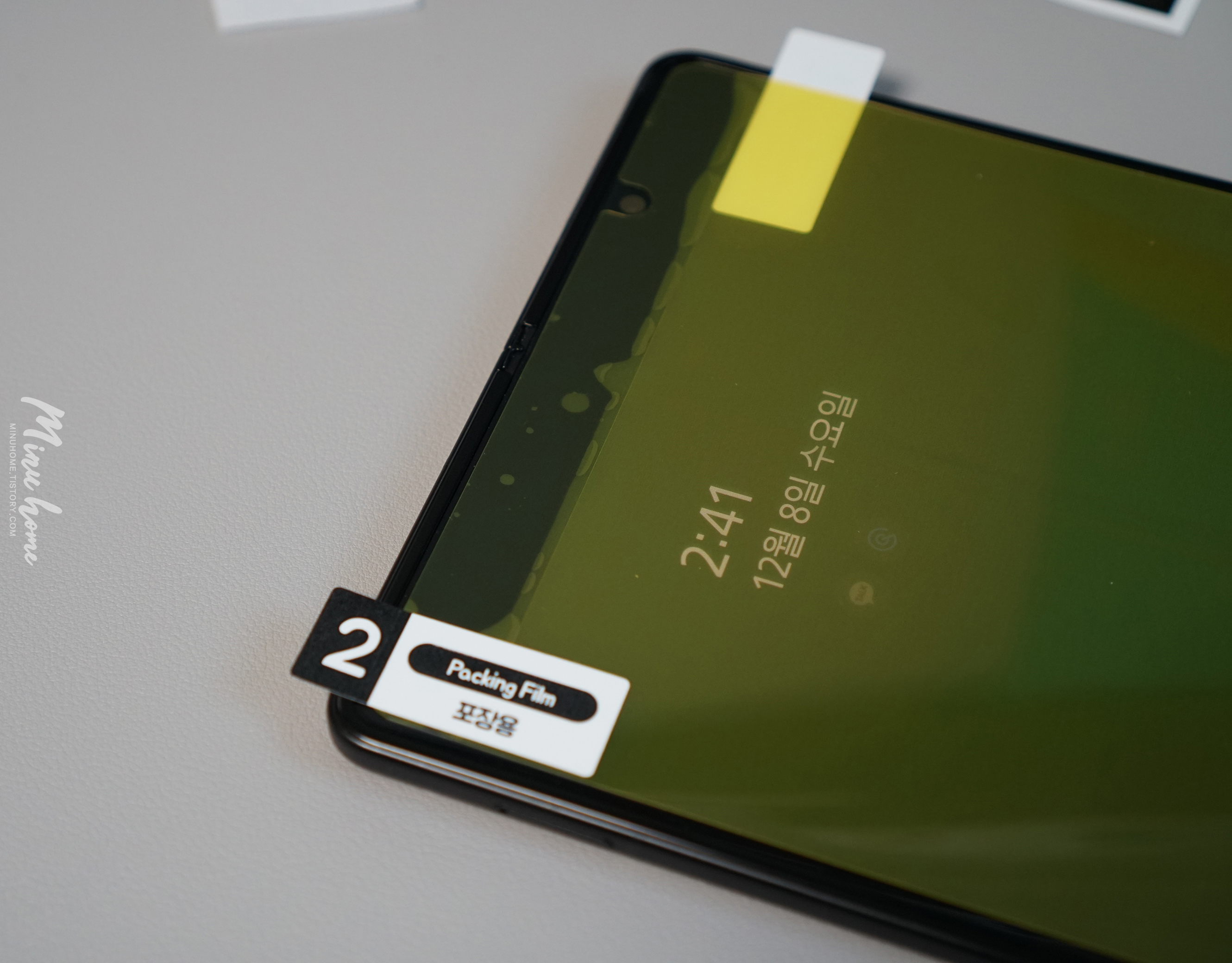 전면 부착은 카메라 홀을 기준으로 아래쪽 과 함께 맞춰 자리를 잡아주고 한번에 밀대를 이용해 부착을 진행하면 먼지없이 쉽게 부착이 가능합니다.