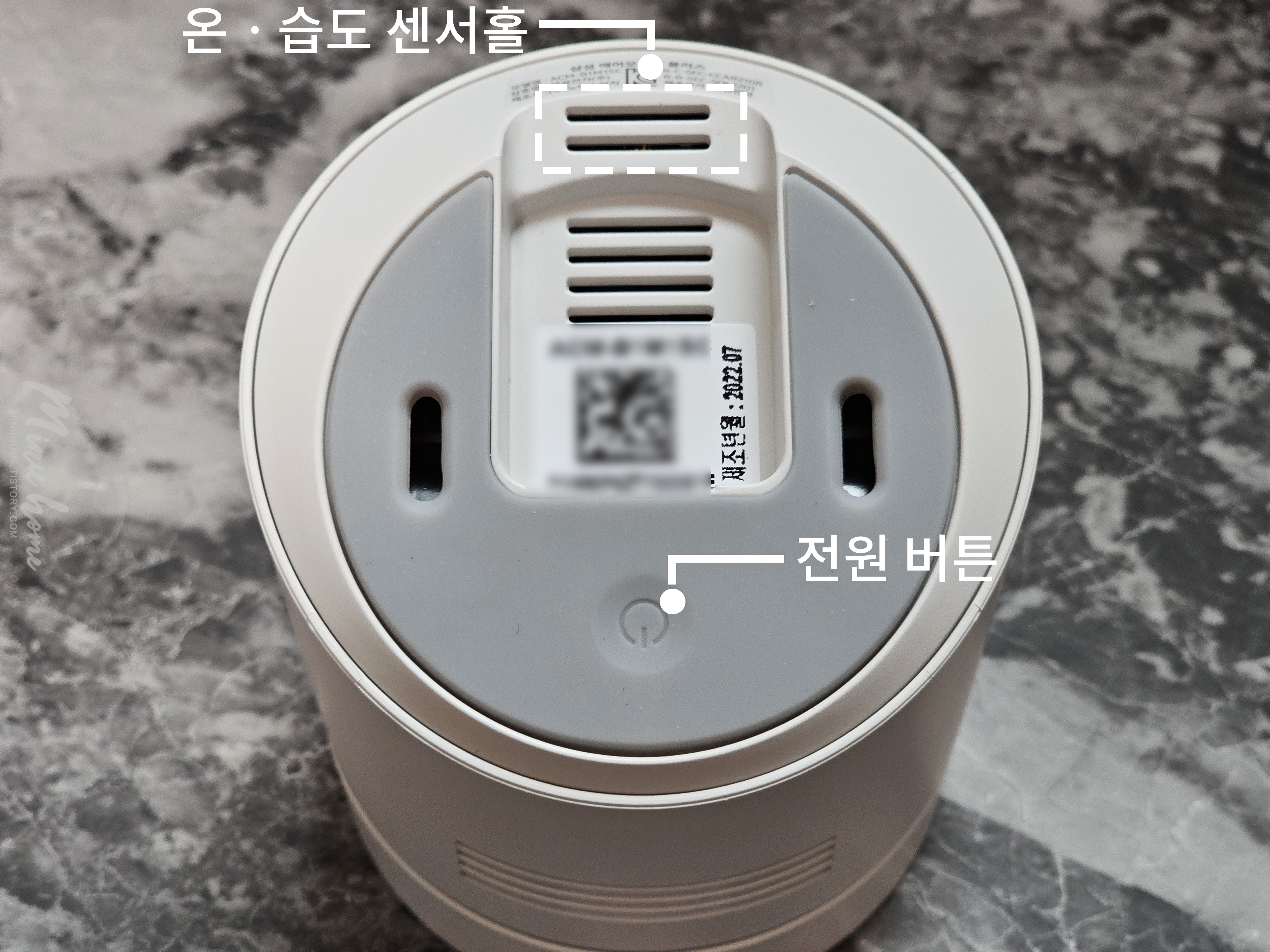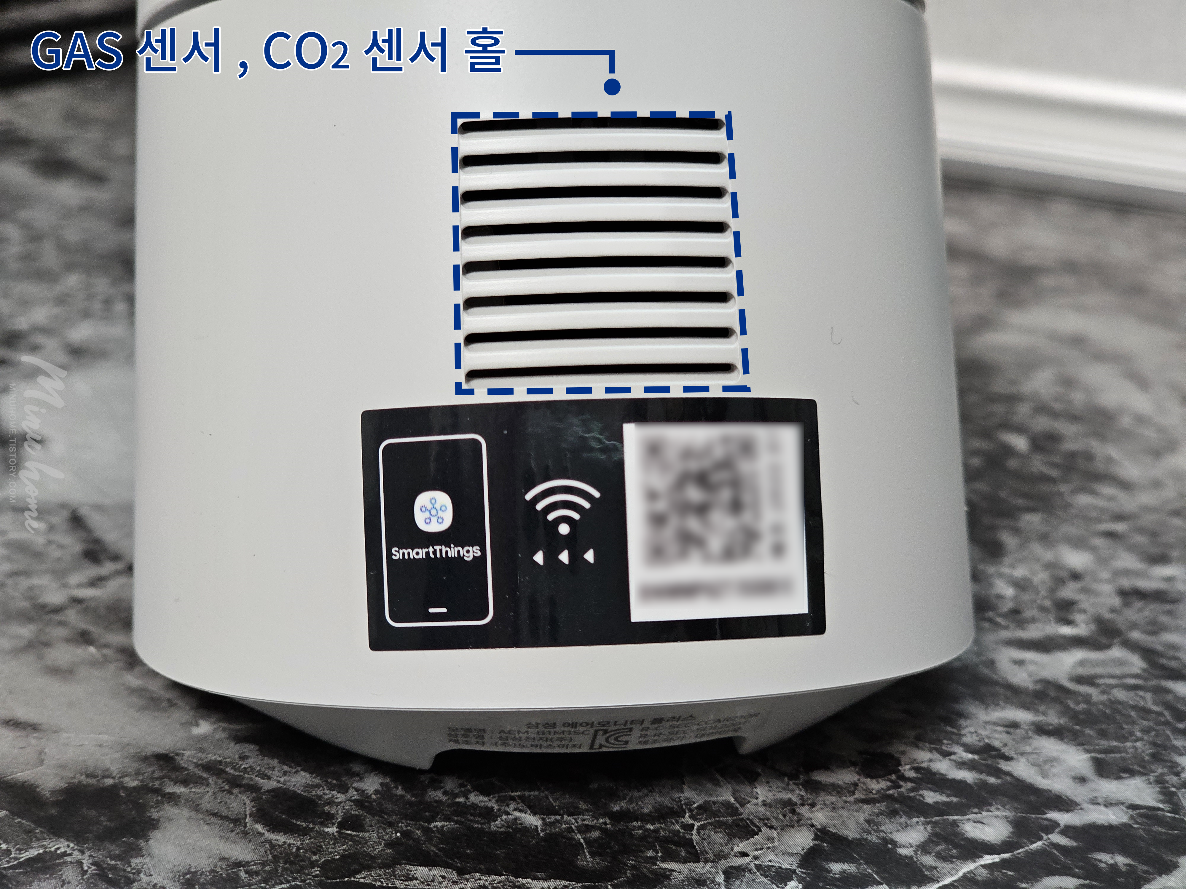 제품의 후면에는 GAS 센서와 CO₂ 측정을 위한 센서홀이 있으며, 스마트싱스와 연동할 수 있는 QR코드 스티커가 있습니다.
