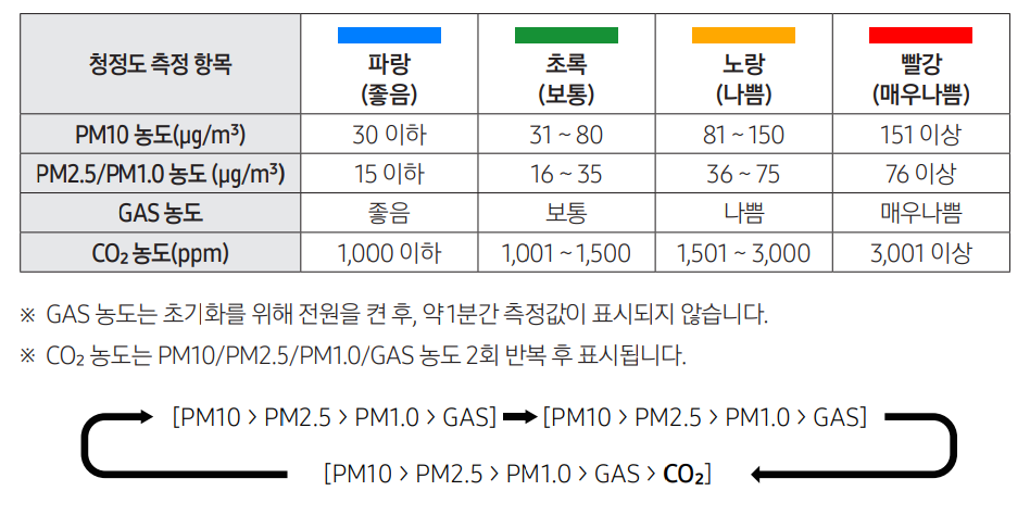 제품의 청정도 측정항목은 LED 불빛에 따라 상태를 확인할 수 있습니다.