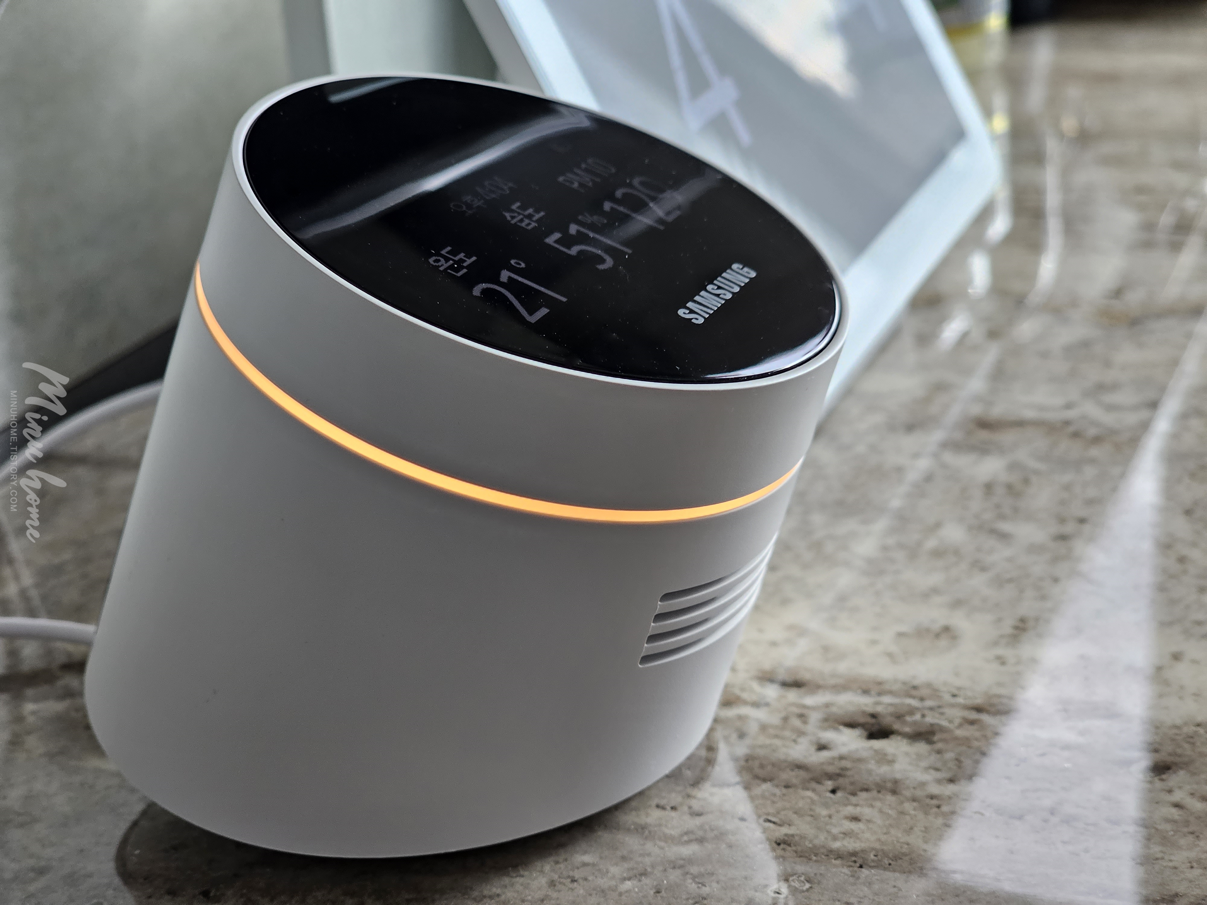해당 제품은 온도와 습도 그리고 미세먼지와 CO₂ 가스 상태를 측정하는 단말로 스마트싱스와 연동해서 실내의 공기질에 따라 다양하게 활용할 수 있는 제품입니다.