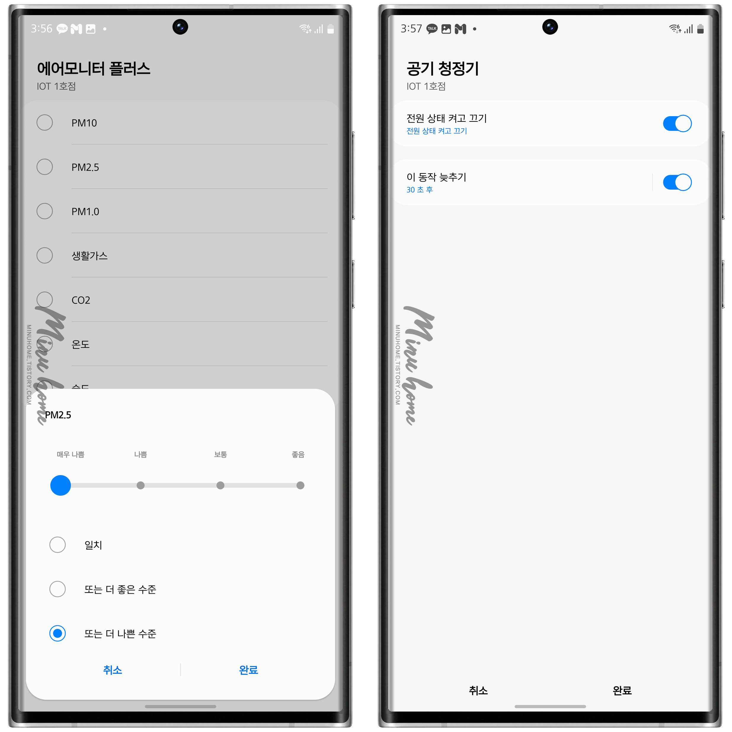 스마트 싱스 앱을 통해 에어모니터 플러스와 공기청정기의 조합을 만들어 자동으로 실행하는 조건문을 만들 수 있습니다.