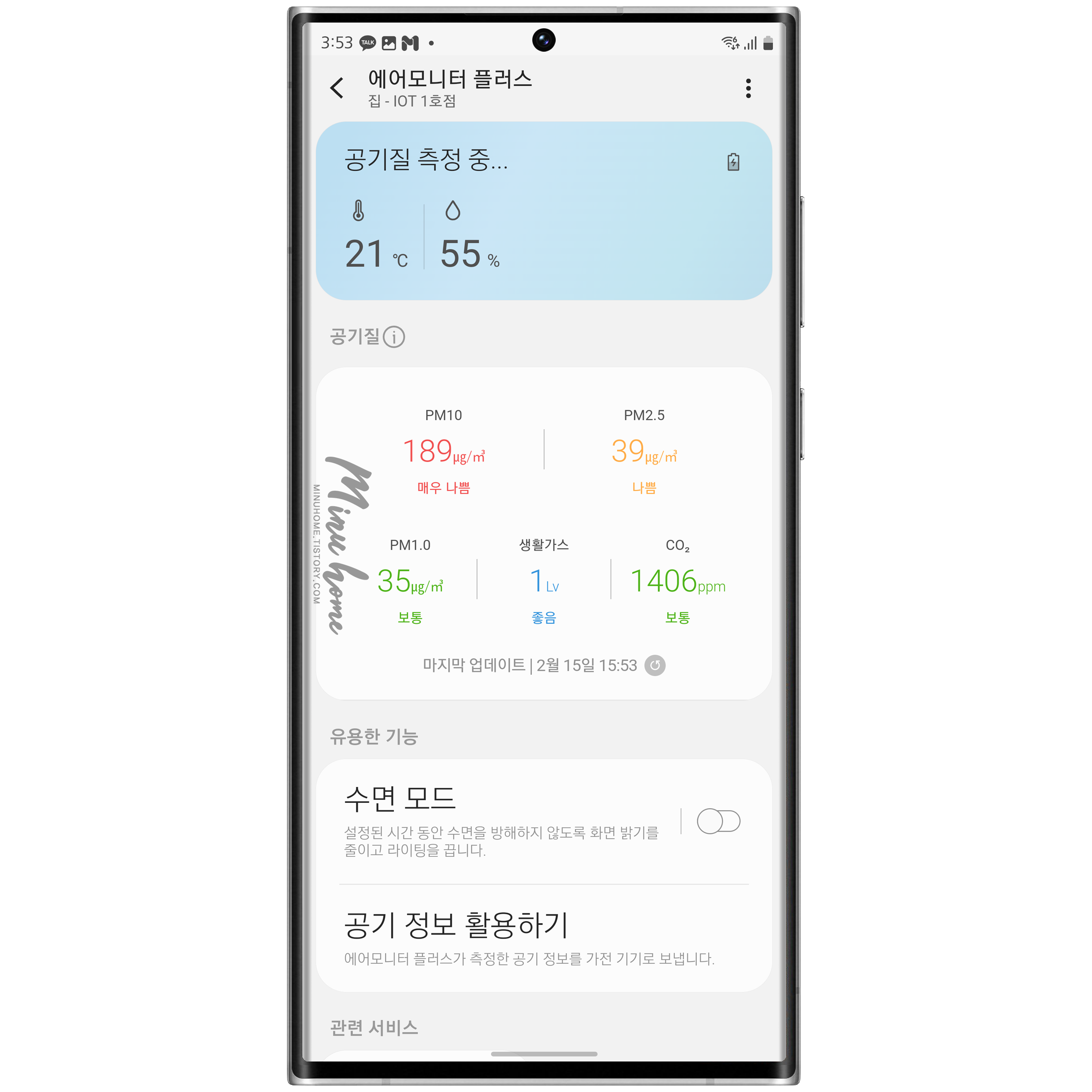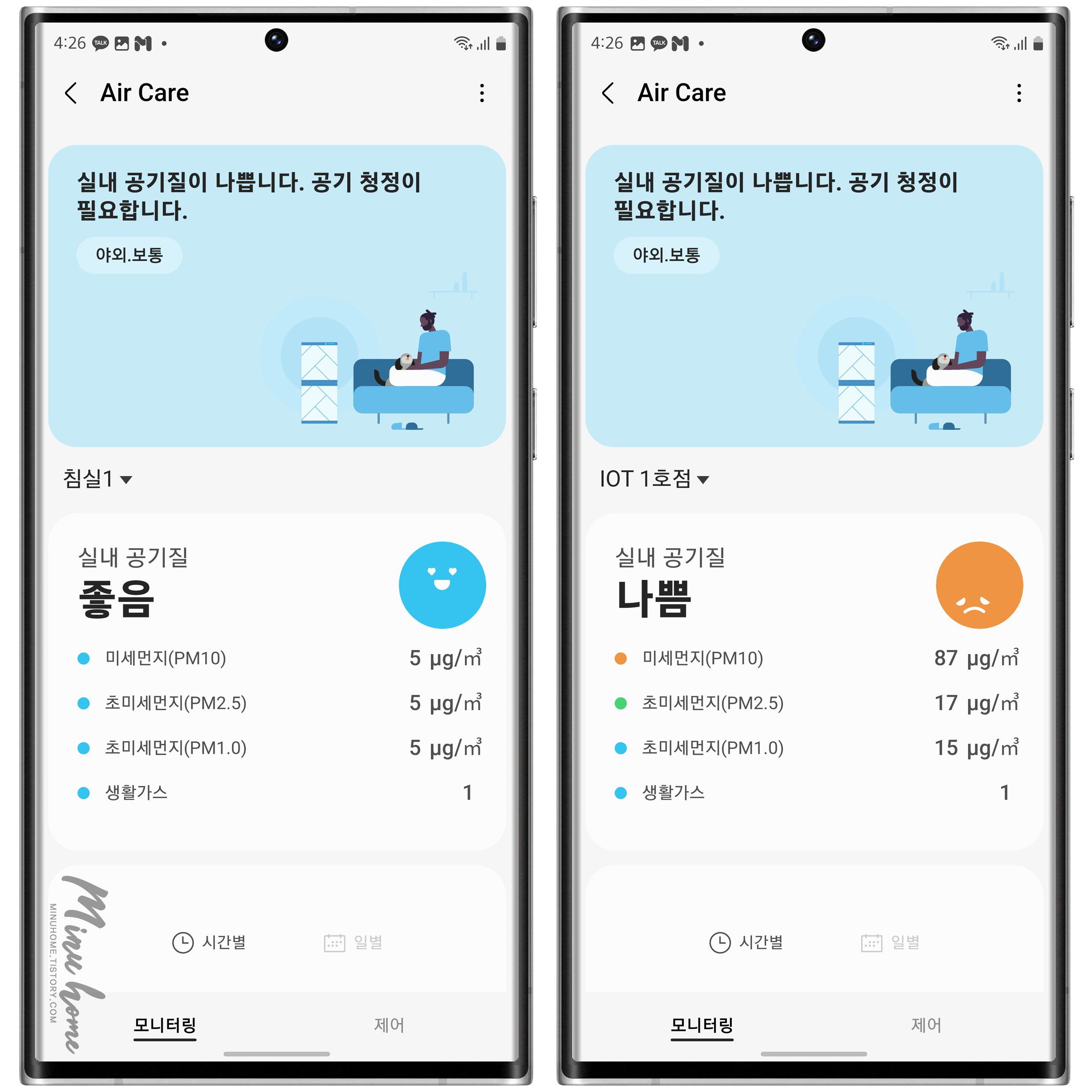저는 제방(침실 1)과 거실에 센서가 있어서 Air Case 기능을 통해 현재 상태를 확인할 수 있습니다.