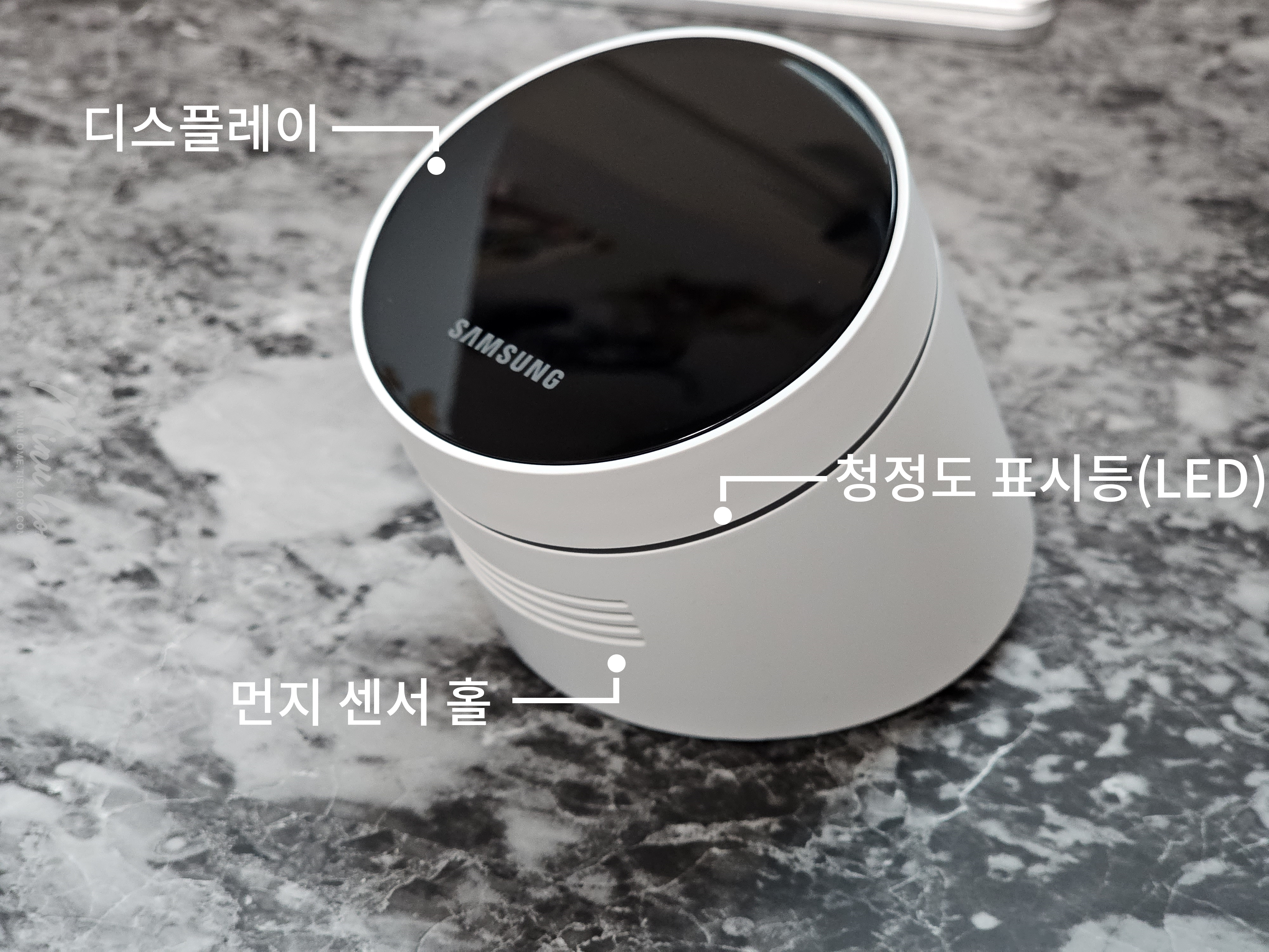 제품의 전체적인 디자인은 살짝 각도를 틀어 전면의 스크린이 보이는 형태의 디자인을 가지고 있으며, 전면에는 상태를 확인할 수 있는 디스플레이와 먼지센서 홀 청정도 표시를 하는 LED가 있습니다.