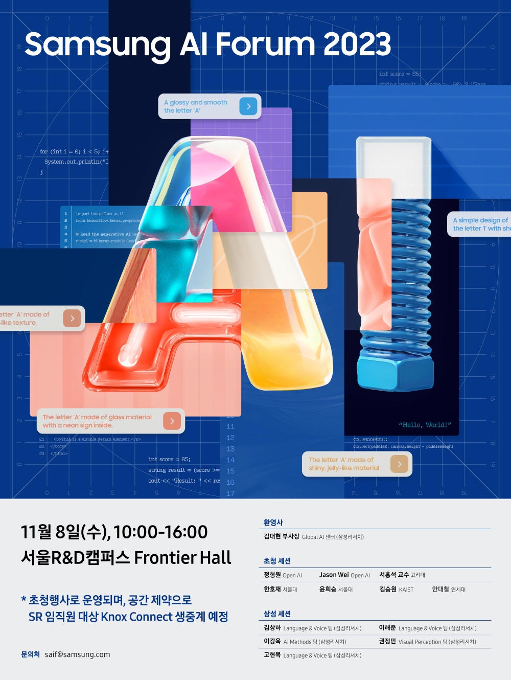 삼성전자가 8일 삼성전자 서울R&D캠퍼스에서 ‘삼성 AI 포럼 2023’ 둘째 날 행사를 개최했다. 삼성리서치에서 주관한 이날 포럼에는 삼성전자의 AI 연구 인력뿐만 아니라, AI 기술 교류를 위해