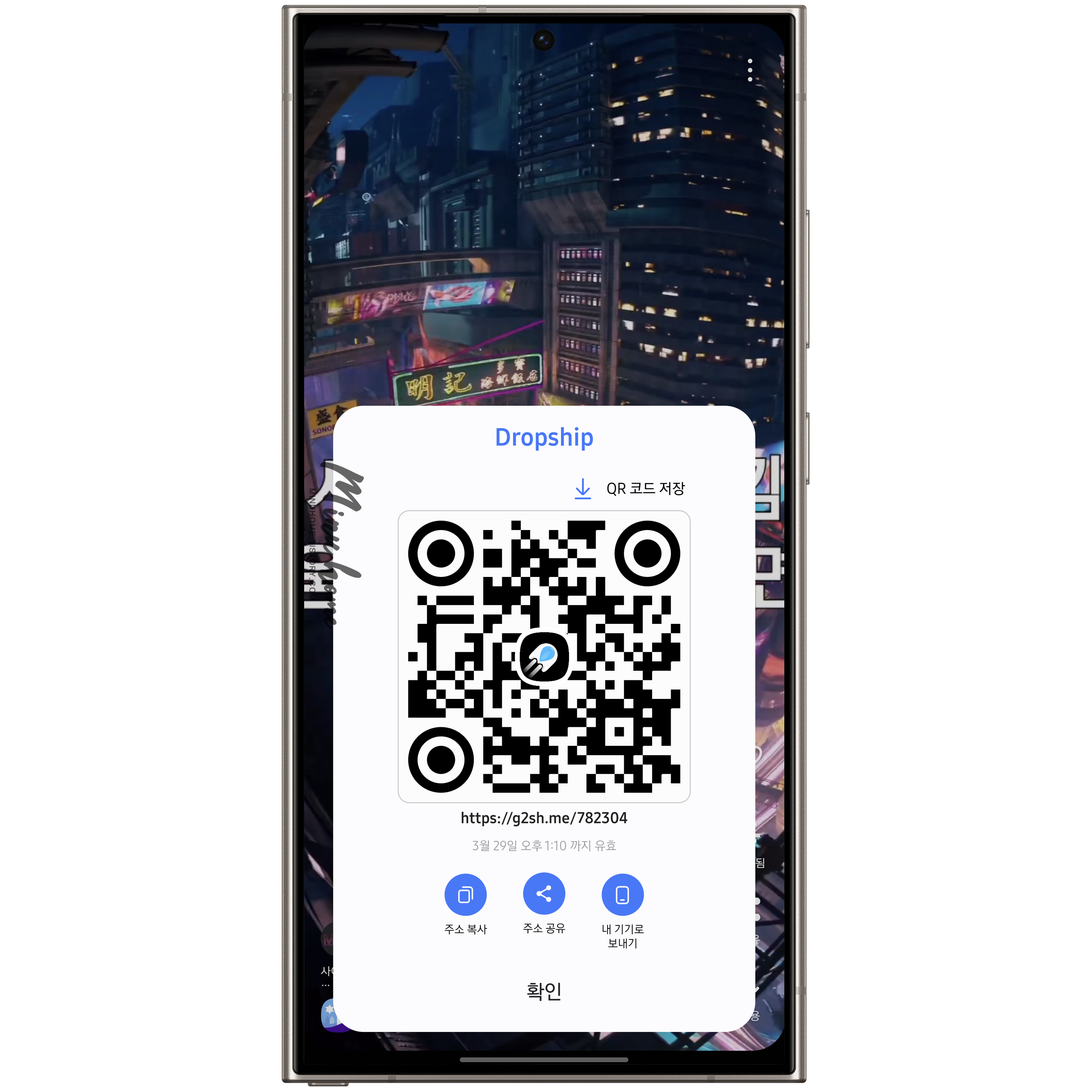공유를 선택한 경우 해당 GTS 정보가 드랍쉽에 QR코드와 링크 생성을 통해 갤럭시 사용자에게 바로 전달도 가능합니다.
